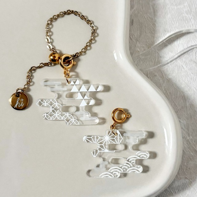 和柄の霞文様をモチーフにしたチャーム、《KASUMI》。 《KASUMI》を含む、「Japanese style」モチーフの一覧はこちら↓ https://shop.hitoyurashop.com/categories/6746420 白を基調としたデザインが、霞の柔らかな気配を感じさせる作品です。バッグやポーチに付けても軽やかで、上品な印象を与えます。 透明なアクリルに半透明ホワイトで霞を描き、やわらかな奥行きを表現。左右のパーツには吉兆を願う伝統文様をそれぞれ配置しています。 【文様に込められた意味】 ・麻の葉文様:無病息災・魔除け ・青海波文様:未来永劫の幸せ ・鱗文様:厄除け ・七宝文様:円満 控えめながらも上品な存在感で、和装小物にもぴったり。感謝を込めて贈る小さなギフトにもおすすめです。 ※チャームのみの販売となります。紐(ストラップ)やボールチェーンなどはついておりませんので、予めご了承くださいませ。 ※カニカンは金属アレルギー非対応です。 【カニカンサイズ】 カニカン外寸:縦10mm、横6mm カニカン穴サイズ:縦3mm、横3mm カニカン開口部:約2mm 【サイズ(チャーム部分のみ)】 全長 約1.5cm、横幅(最長)2.1cm 【重さ】 およそ1グラム 【アレルギー非対応パーツ】 ・カニカン 【ギフト対応について】 作品1点が1箱にぴったり入るサイズのギフトボックスを有料でご用意しております。 必要な箱数を以下のリンクからご一緒にカートに入れてご購入下さいませ。 →https://shop.hitoyurashop.com/items/79346860 ------------------------------------- ご購入の際は、「購入に関するご注意」を必ずご確認いただきますようお願いいたします。 配送方法や送料についても、こちらからご確認いただけます。 →https://shop.hitoyurashop.com/p/00002 ------------------------------------- ※作品に使用しているアクリルは、アルコールなどで拭き取りますとひび割れの原因になることがございます。汚れた場合は布などで優しく拭き取ってください。 ※アクリルの着色面は、とがったものや先の鋭いものでひっかけますとはがれてしまう場合がございます。丁寧にお取り扱いいただきますようよろしくお願いいたします。 ※本作品は部分的に透ける仕様です。背景色によっては、柄や色が見えづらい場合がございます。
