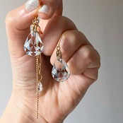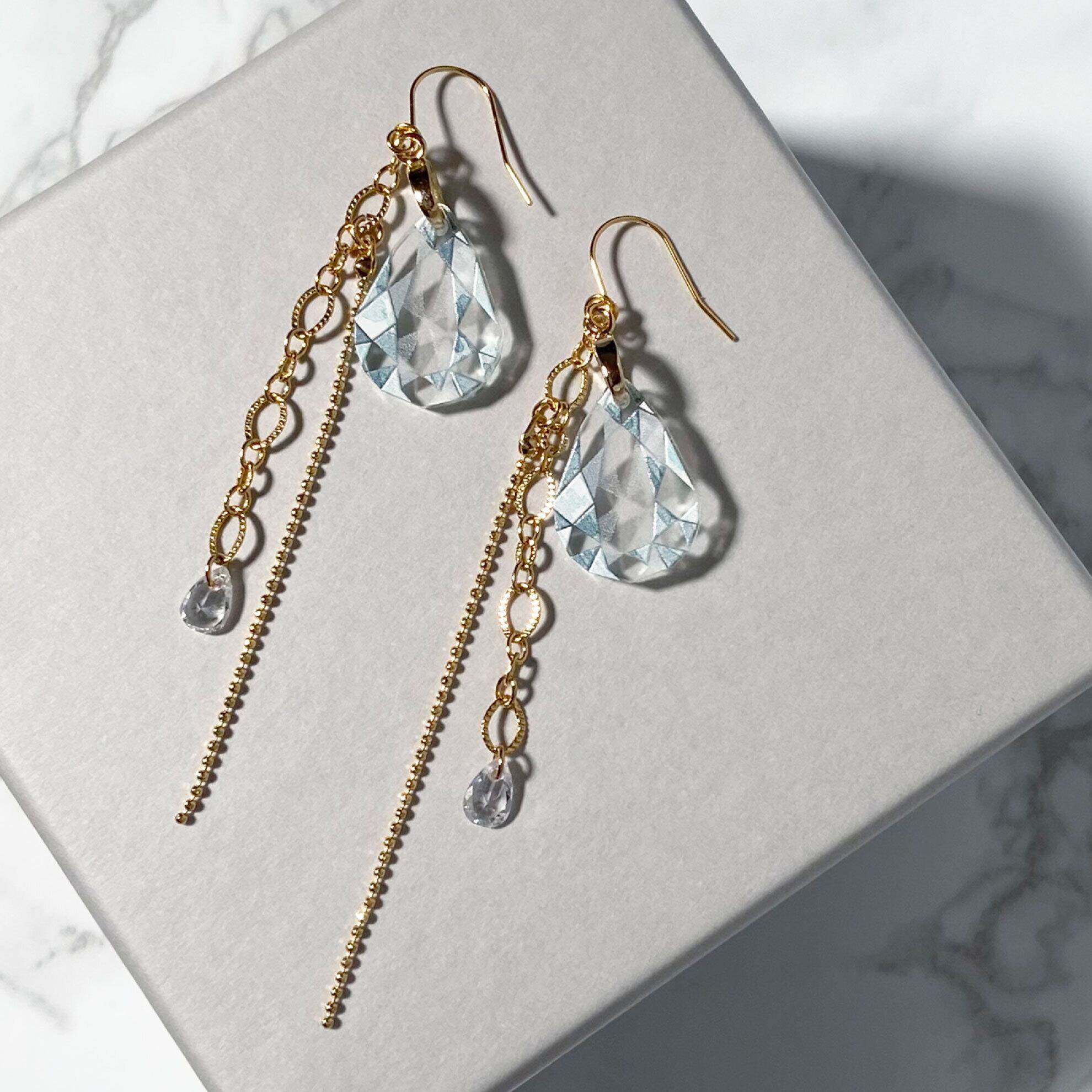 柔らかく優雅な雰囲気のカット方法である『ペアシェイプカット』の耳飾りは、チェーンなしだと存在感がありながらもシンプルで上品に。 チェーンありだとよりエレガントで華やかに着用いただけます。