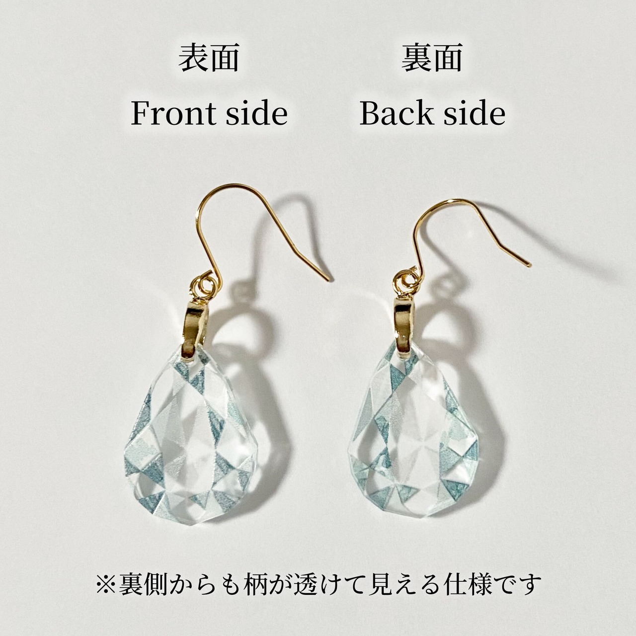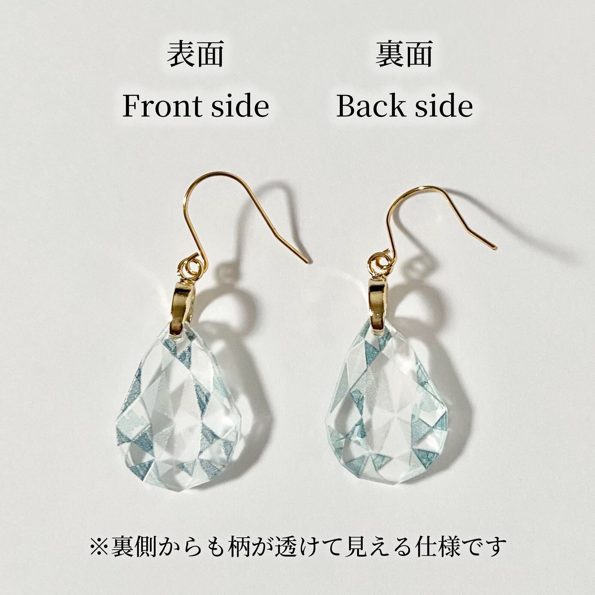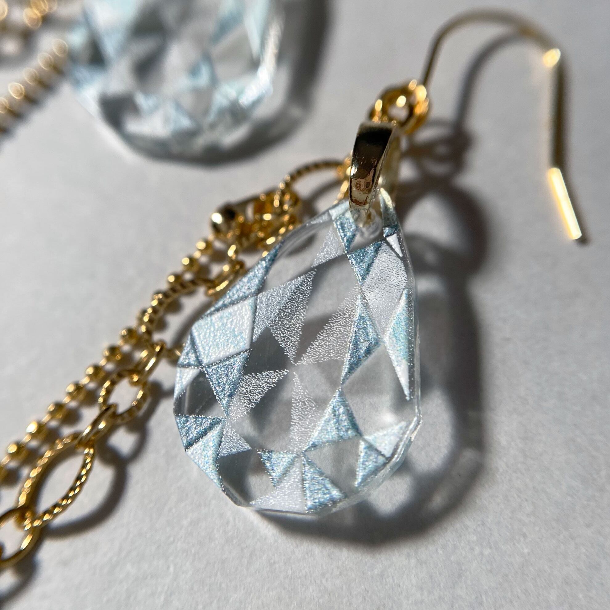 ドロップ型のアクリルパーツは、宝石カットの一つ『ペアシェイプカット』をイメージ。