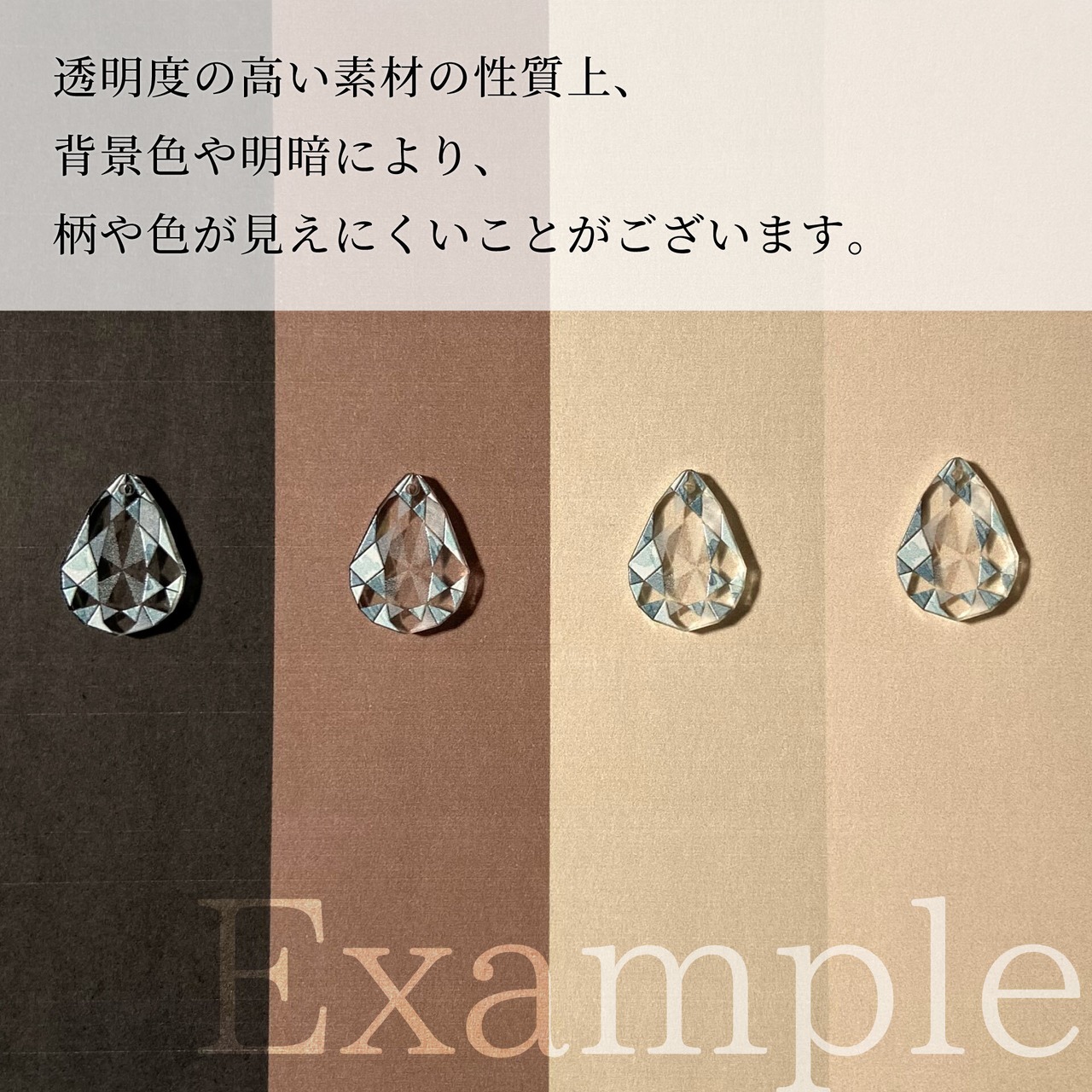 ※透明度の高い素材の性質上、背景が暗い色であったり、暗い場所での着用の場合、柄や色が見えにくいことがございます。
