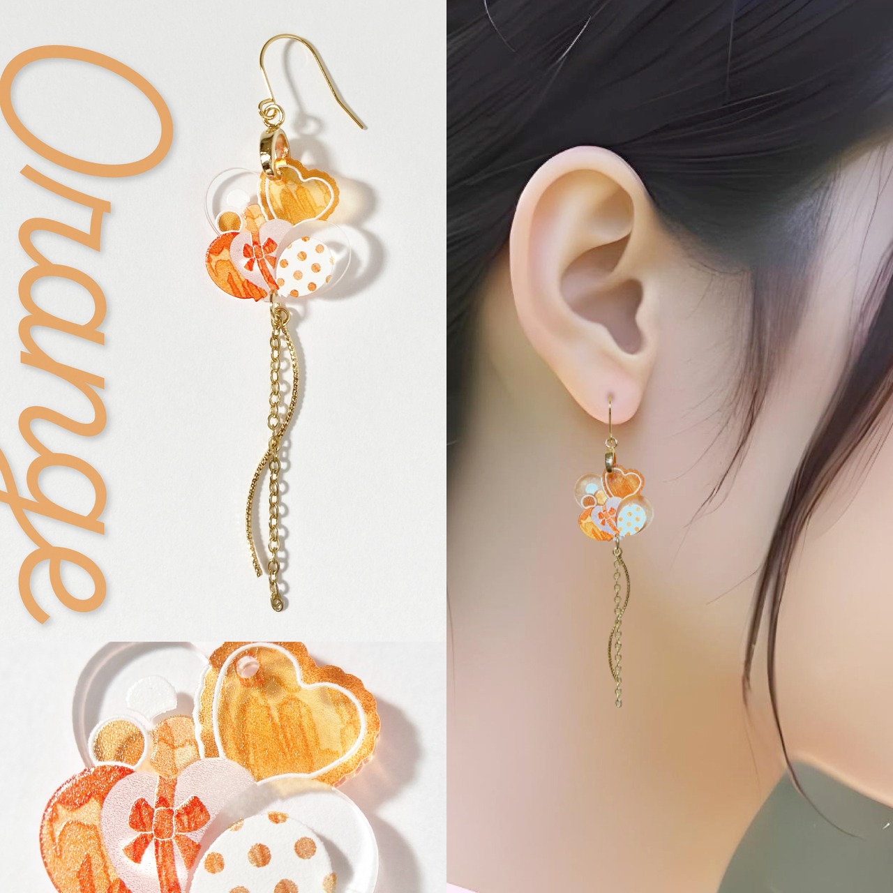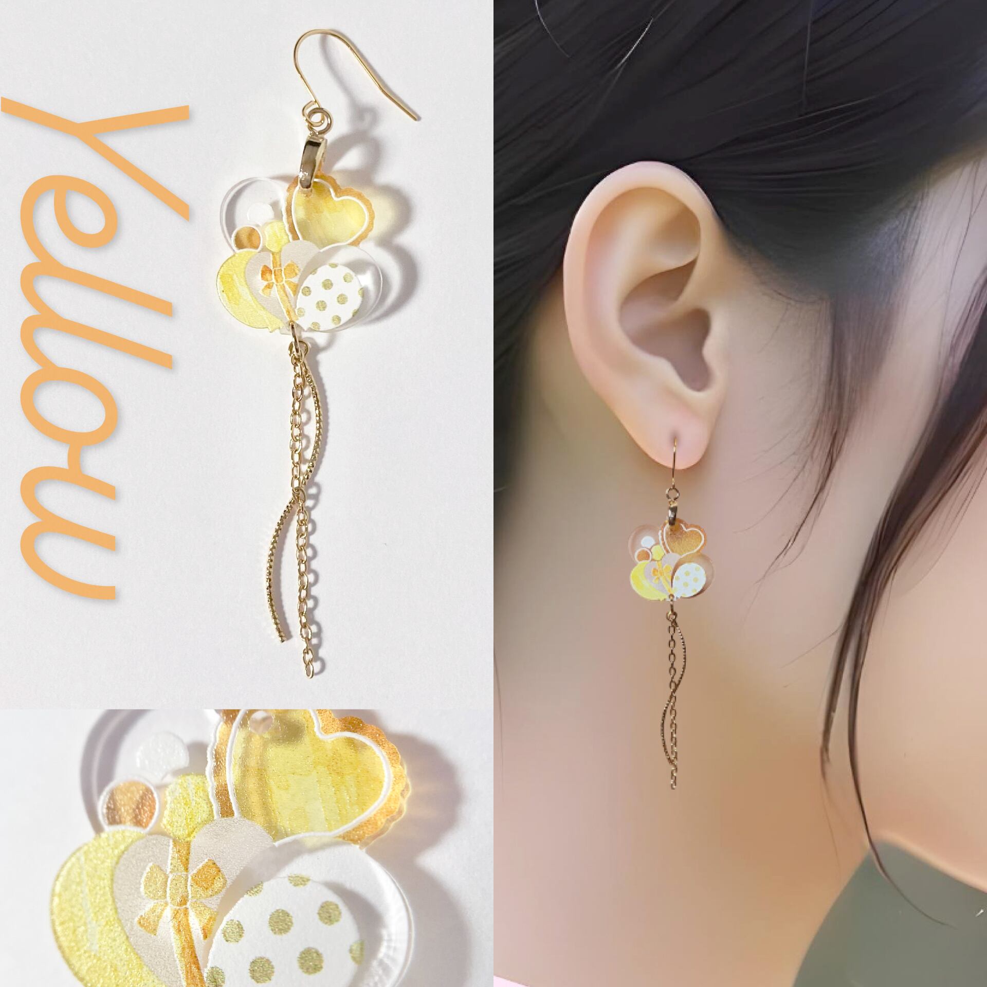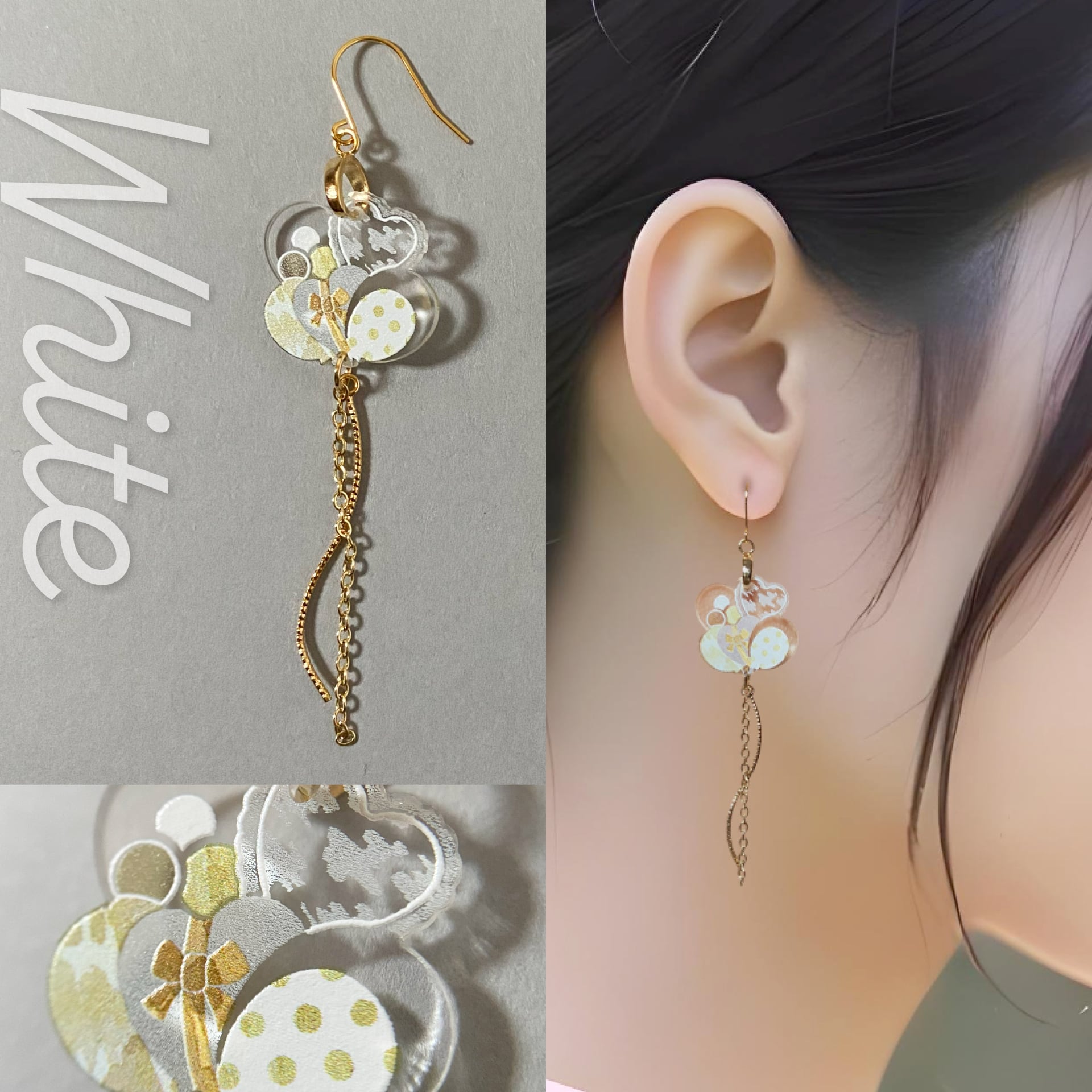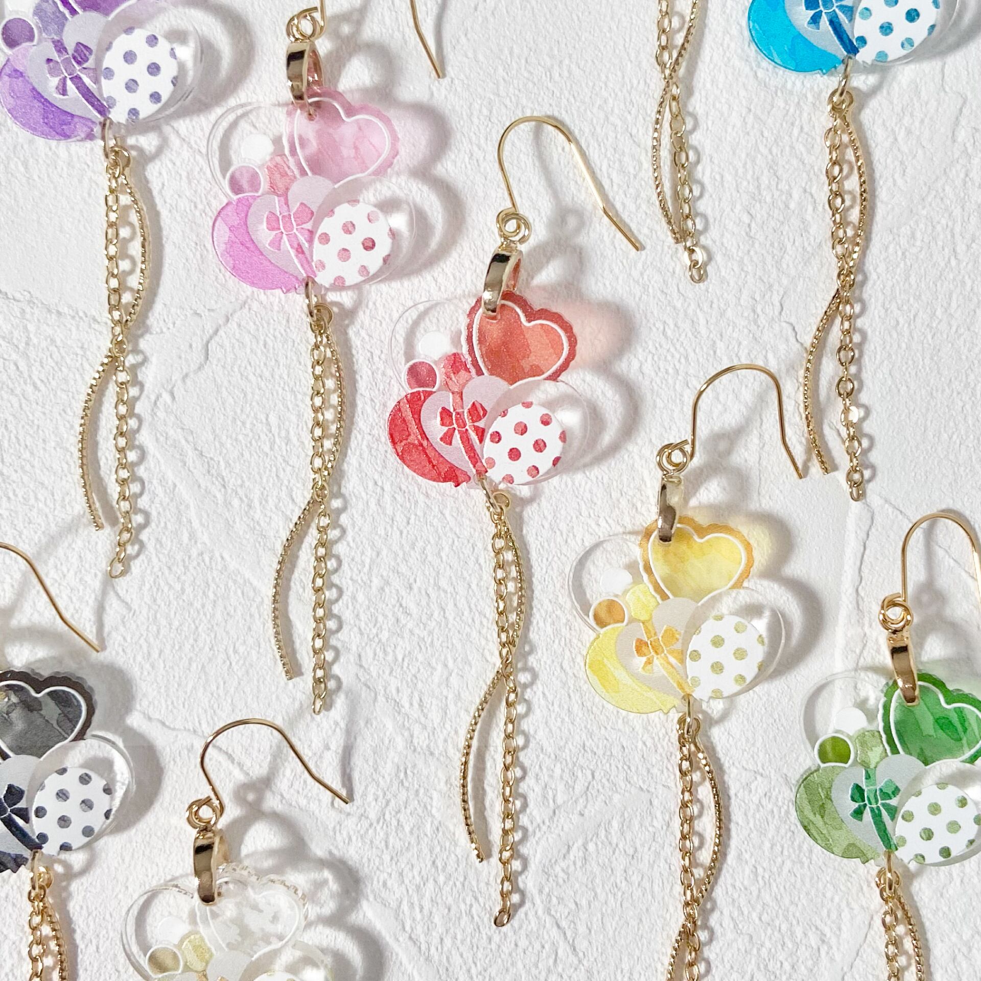 特別な日にも、いつもの日常をパッと明るくしたい時にも、付けると心が風船のようにふわりと浮かぶ、楽しい耳飾りです。