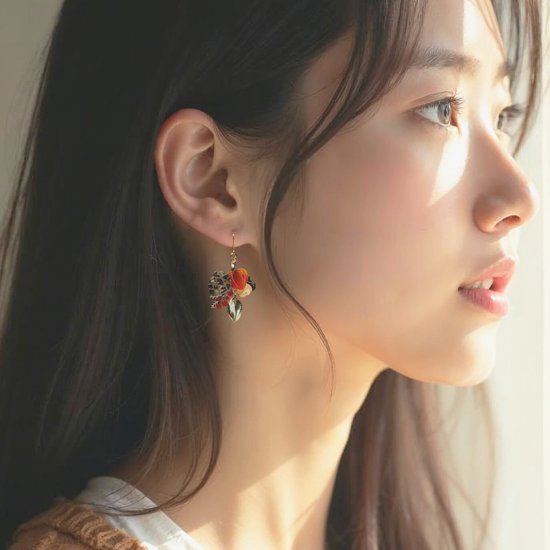 ナンテンやホオズキ、松ぼっくりやドングリを組み合わせたデザインで、耳元にさりげなく季節感を添えます。