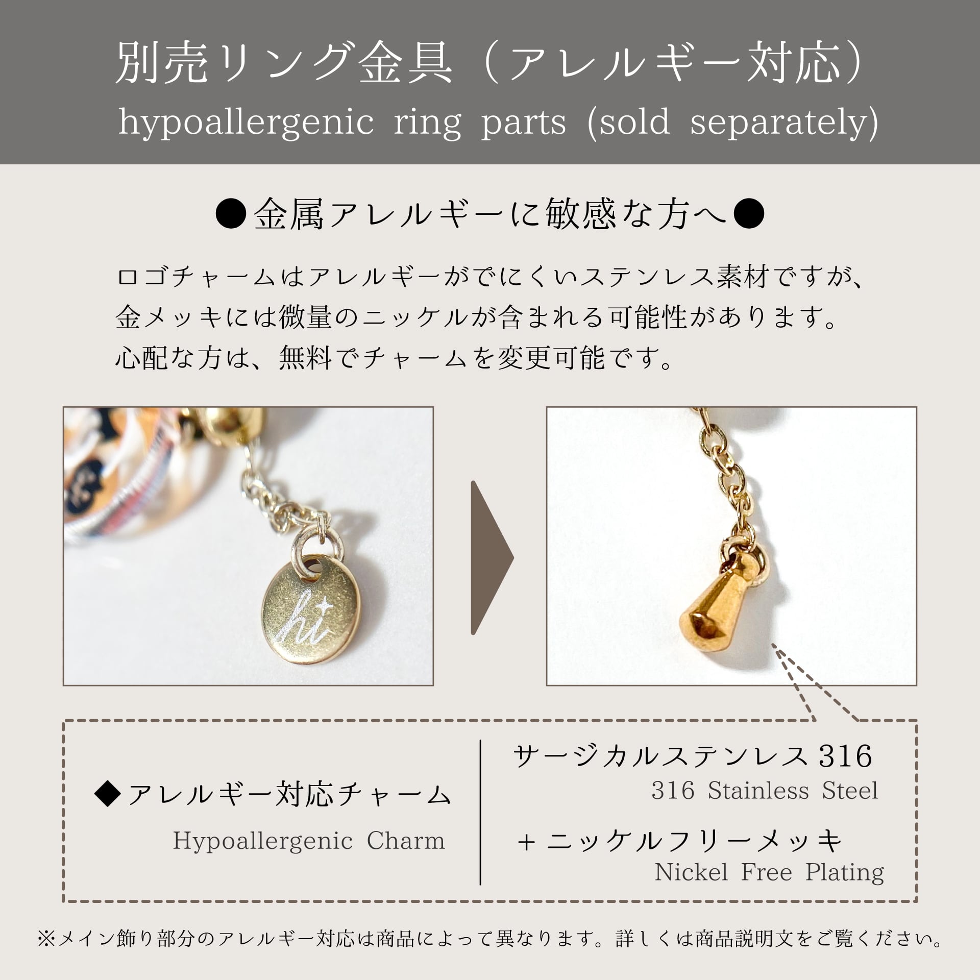 『引き輪の着脱は難しい』『付け替え機能なしで、チャームとリングが一対で欲しい』という方に向けたオプションです。