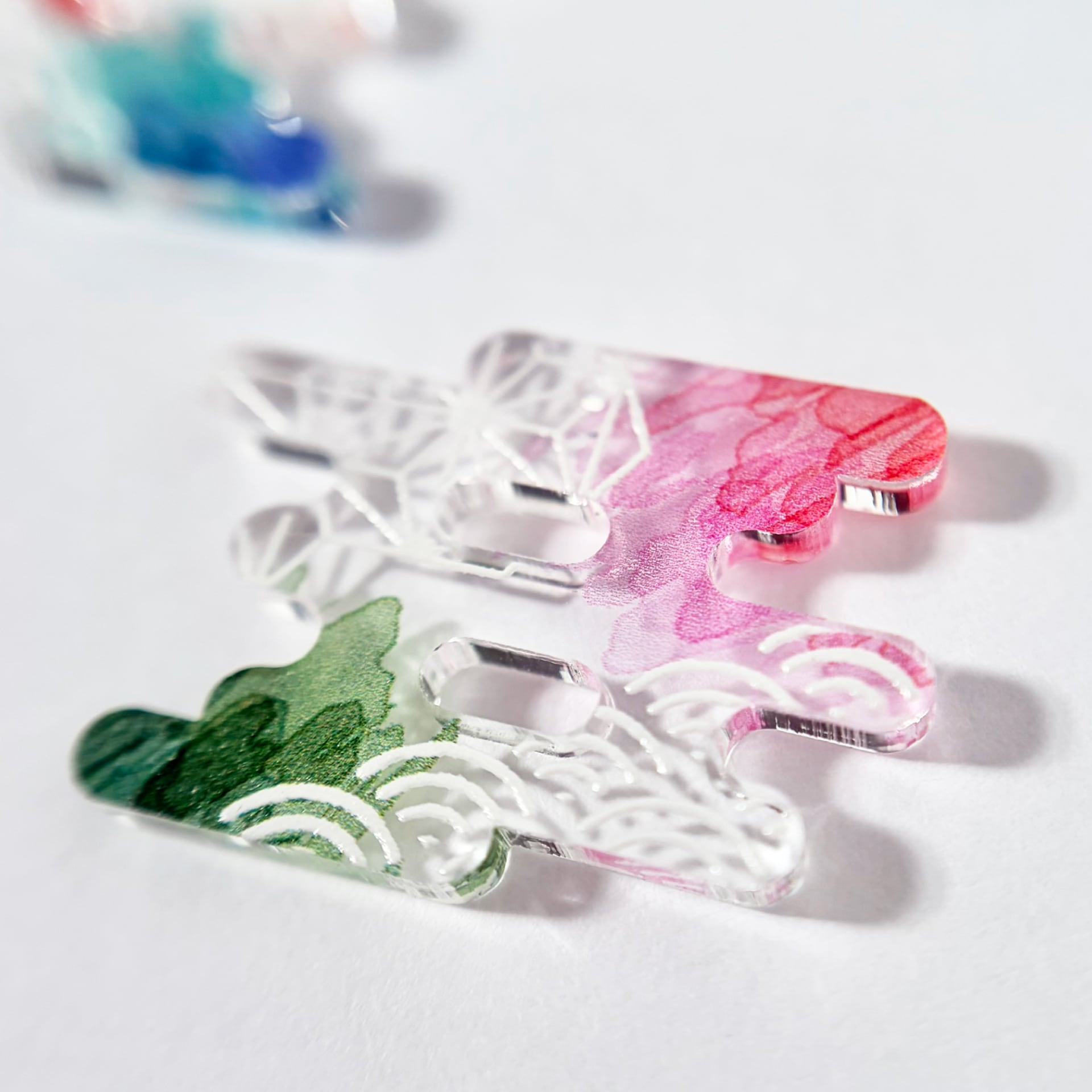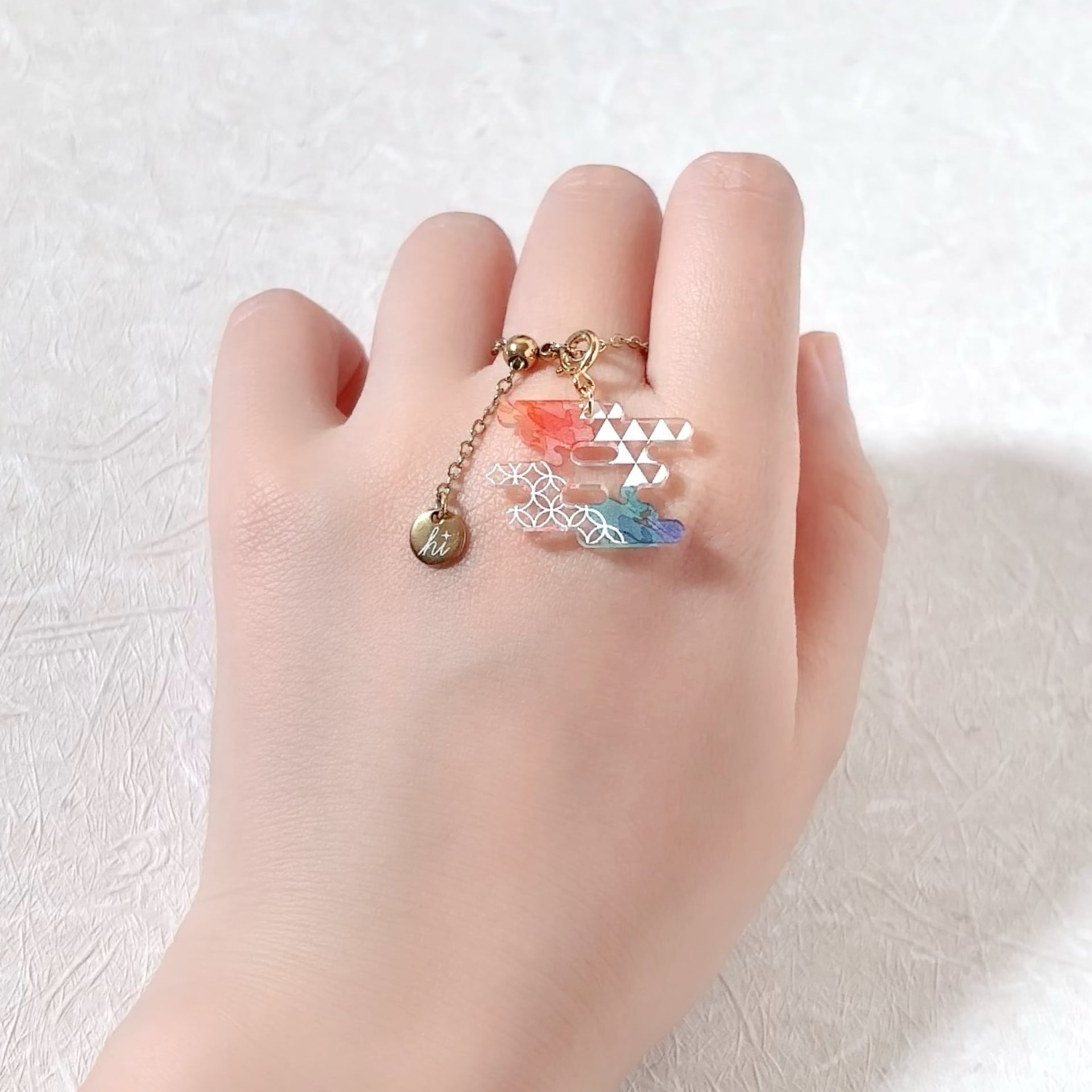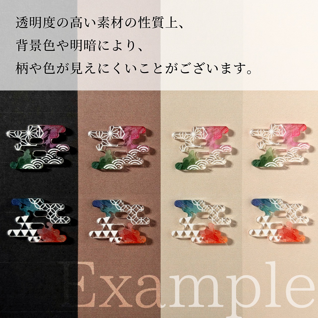 アクリルに丸く抜き加工を施し、霞がたなびくようなやわらかな印象を表現。縦1.5cm、横2.1cmのパーツが、手先に上品な存在感を添えます。