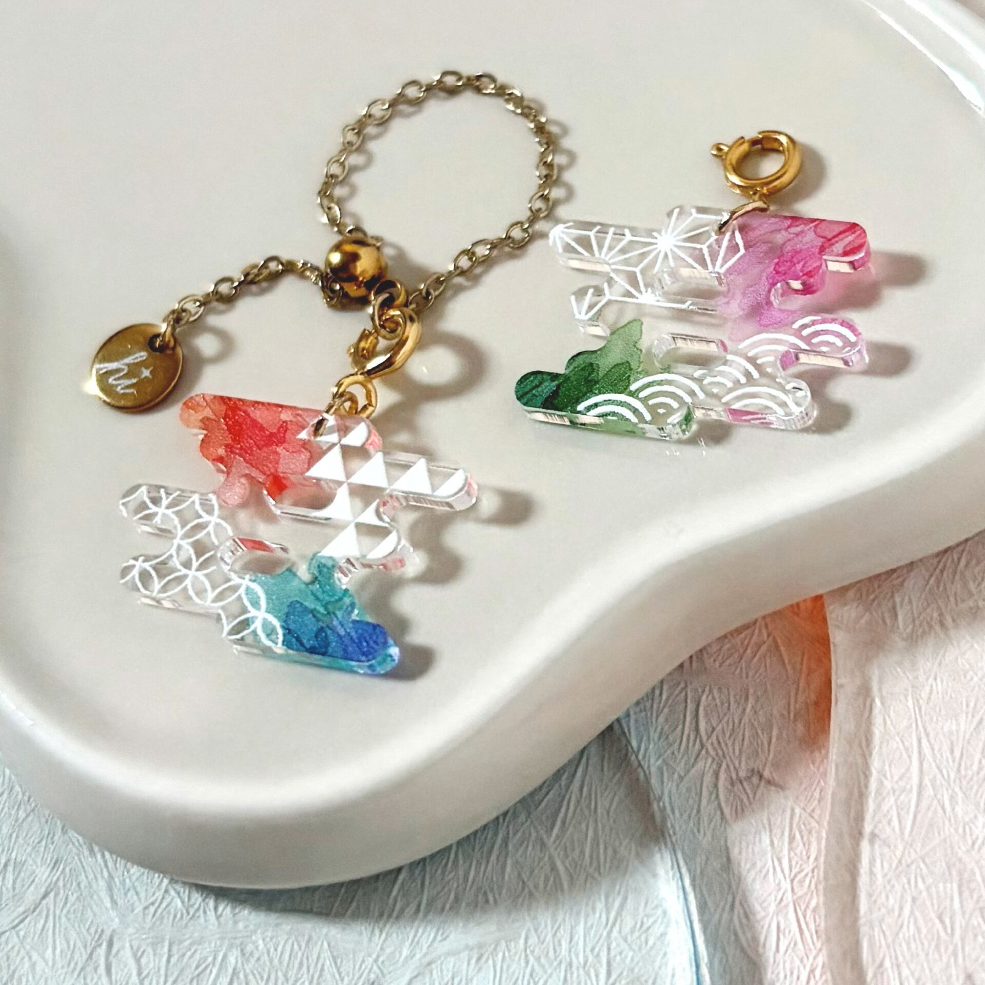 四季カラーでは、春夏の桃色と緑、秋冬の橙と青を水彩調で重ね、季節の移ろいを色彩で描き出しました。左右のパーツには、吉兆を願う伝統文様をあしらっています。