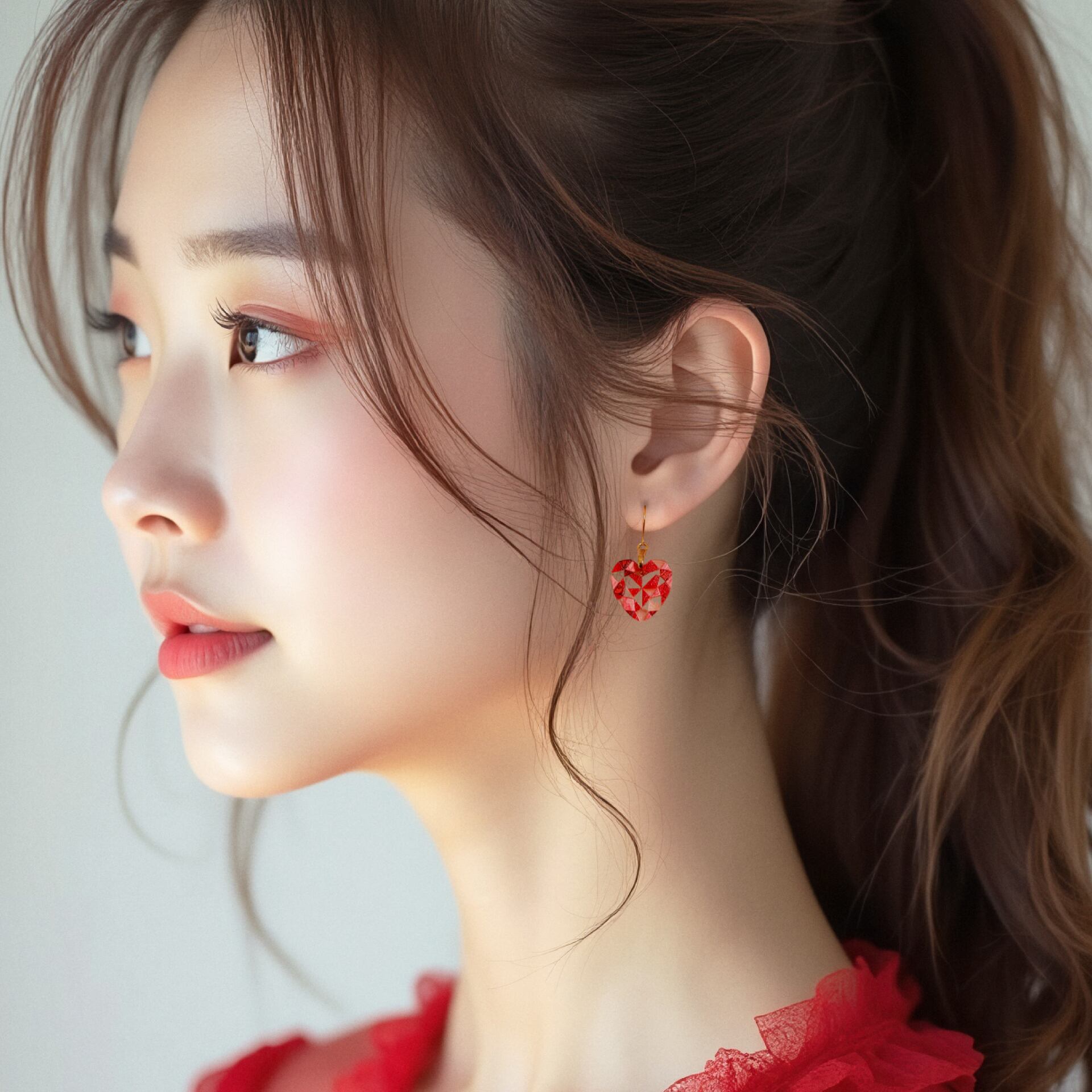 レッドカラーは、鮮やかで澄んだトーンが印象的。光を受けると透明部分に反射が生まれ、動くたびに輝きを添えます。