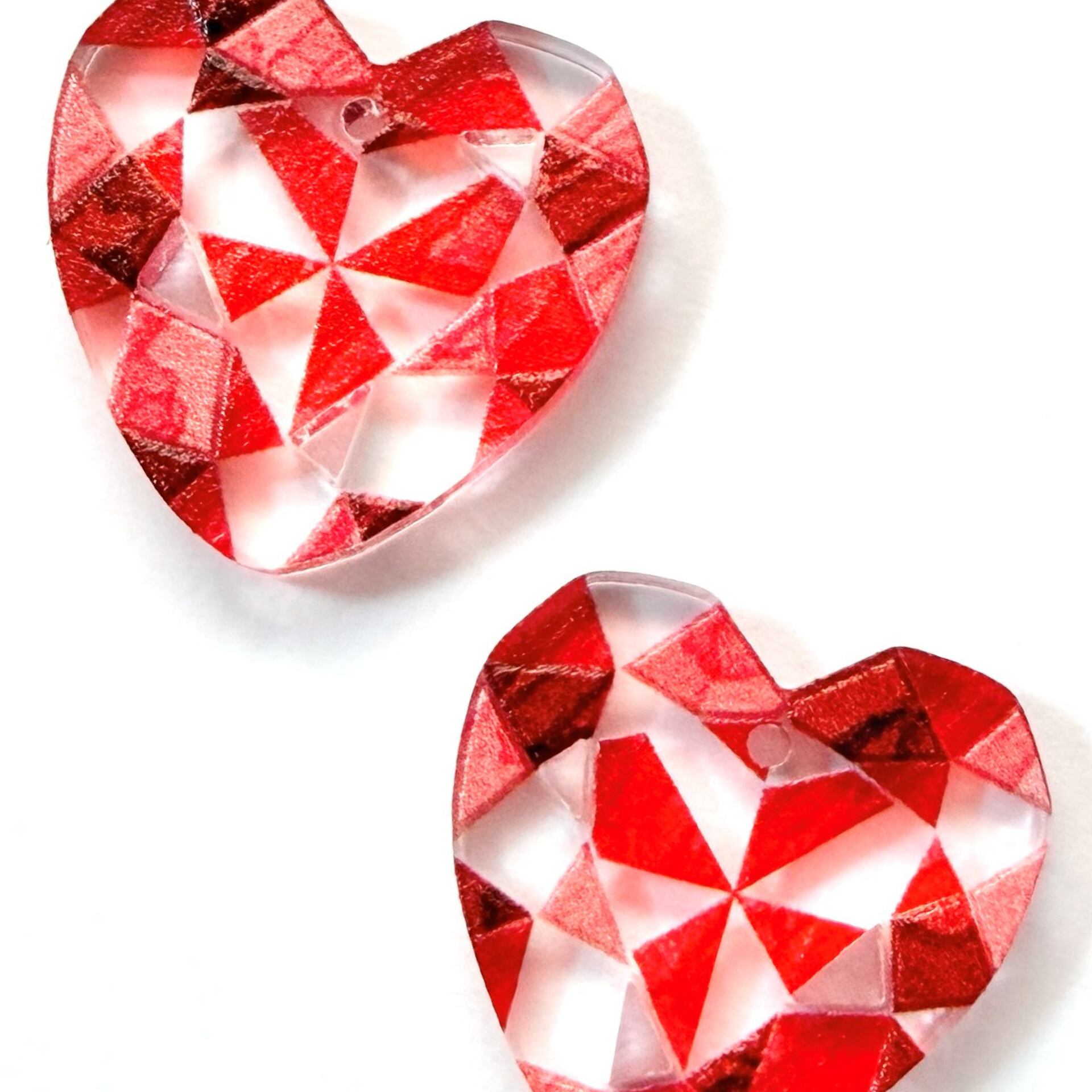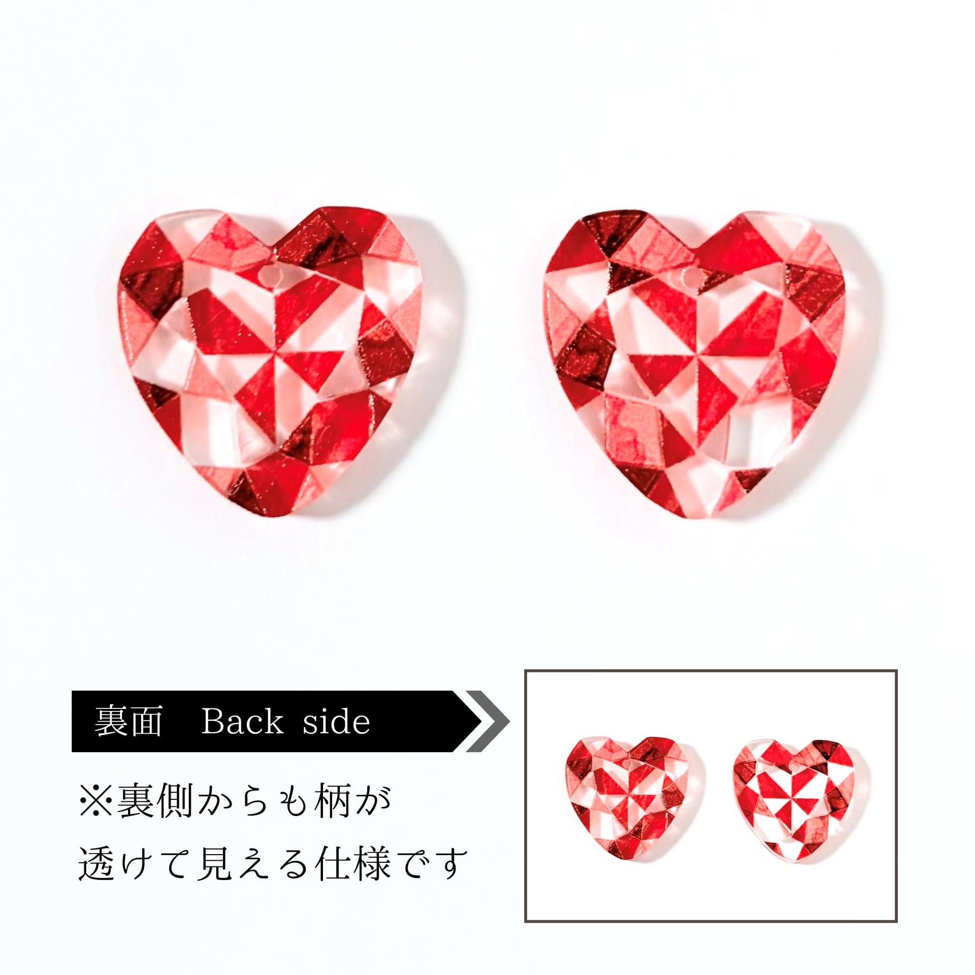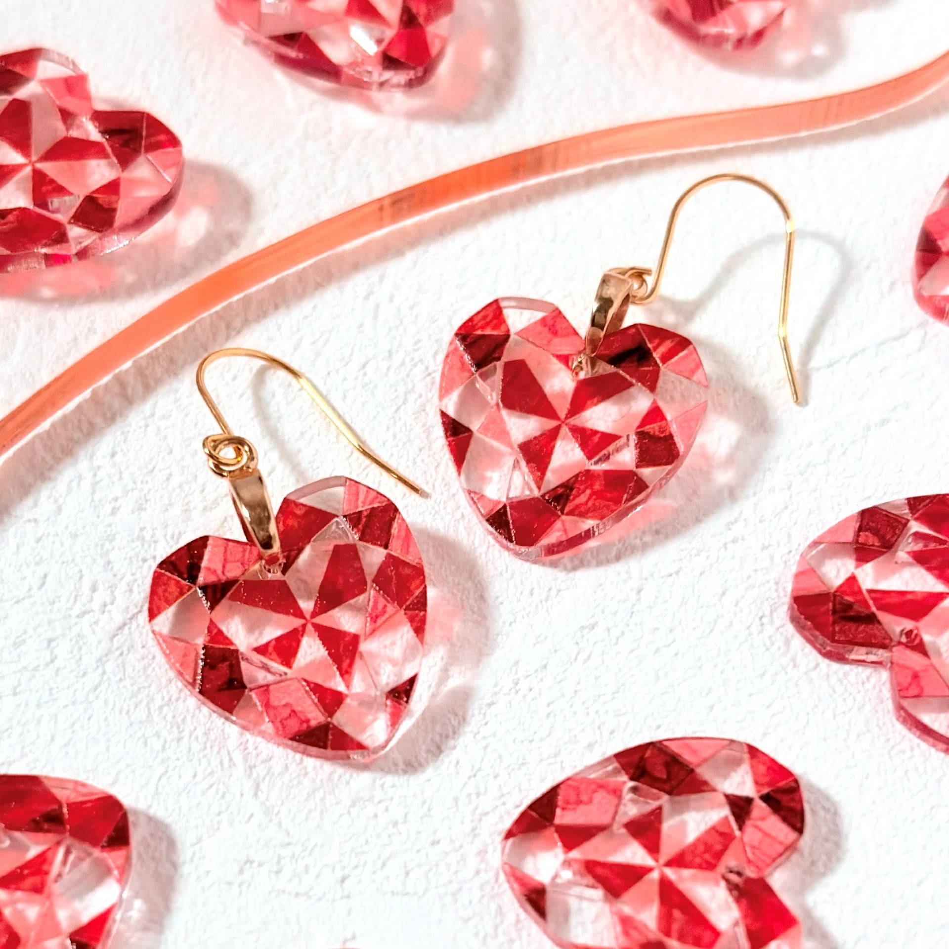 透明感のあるアクリルを使い、宝石のカットを思わせるきらめきを模様で表現した耳飾り。