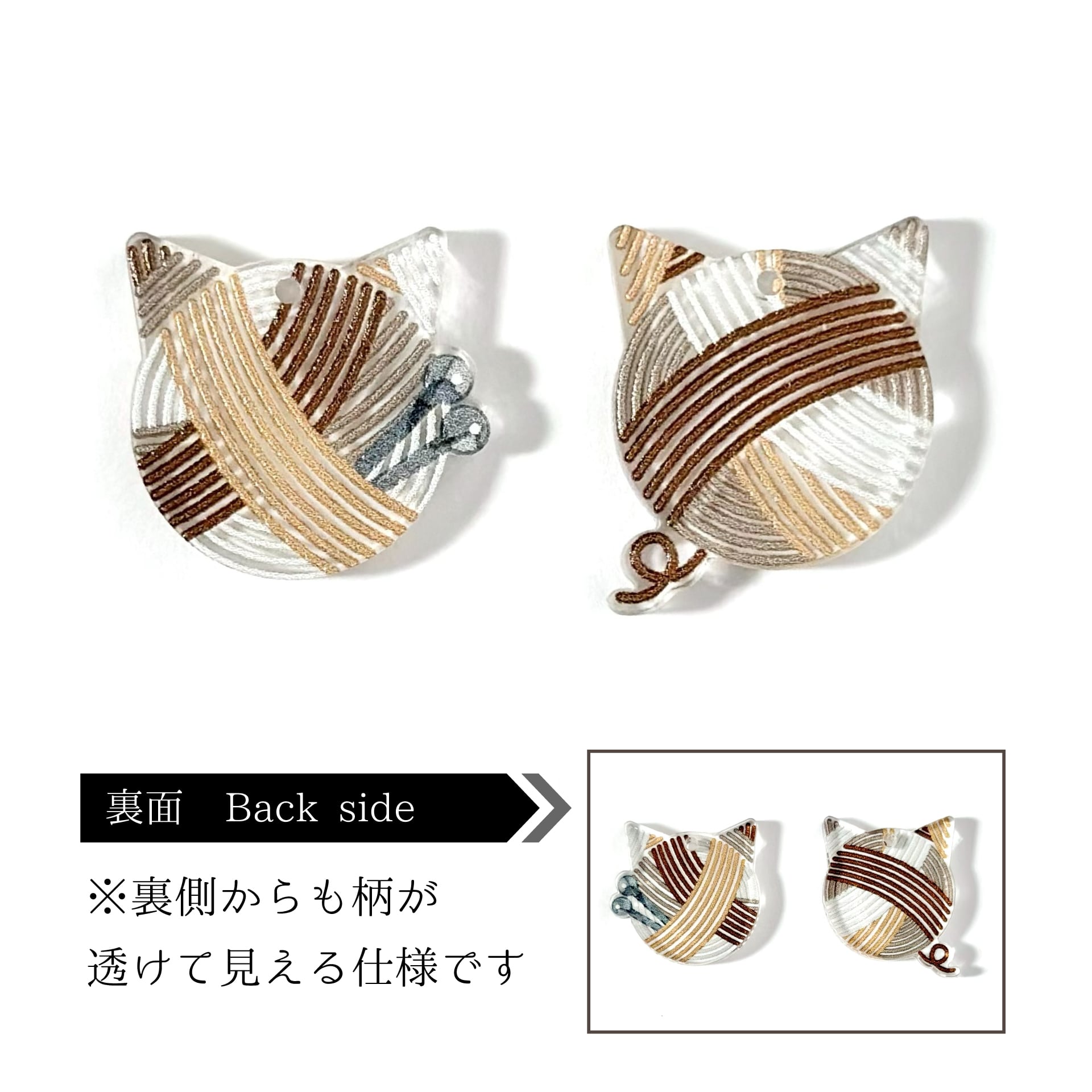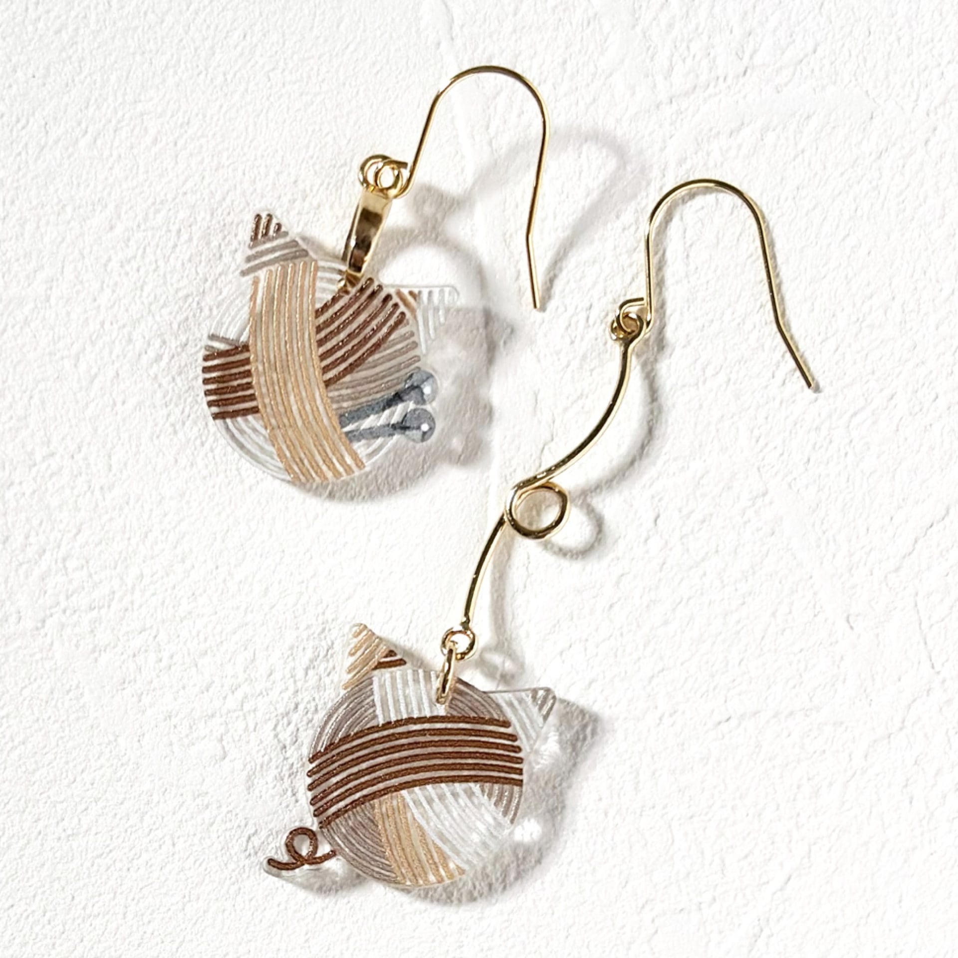 片方は編み棒が刺さった毛糸玉、もう片方は毛糸玉がメタルバーから揺れるアシンメトリー仕様。