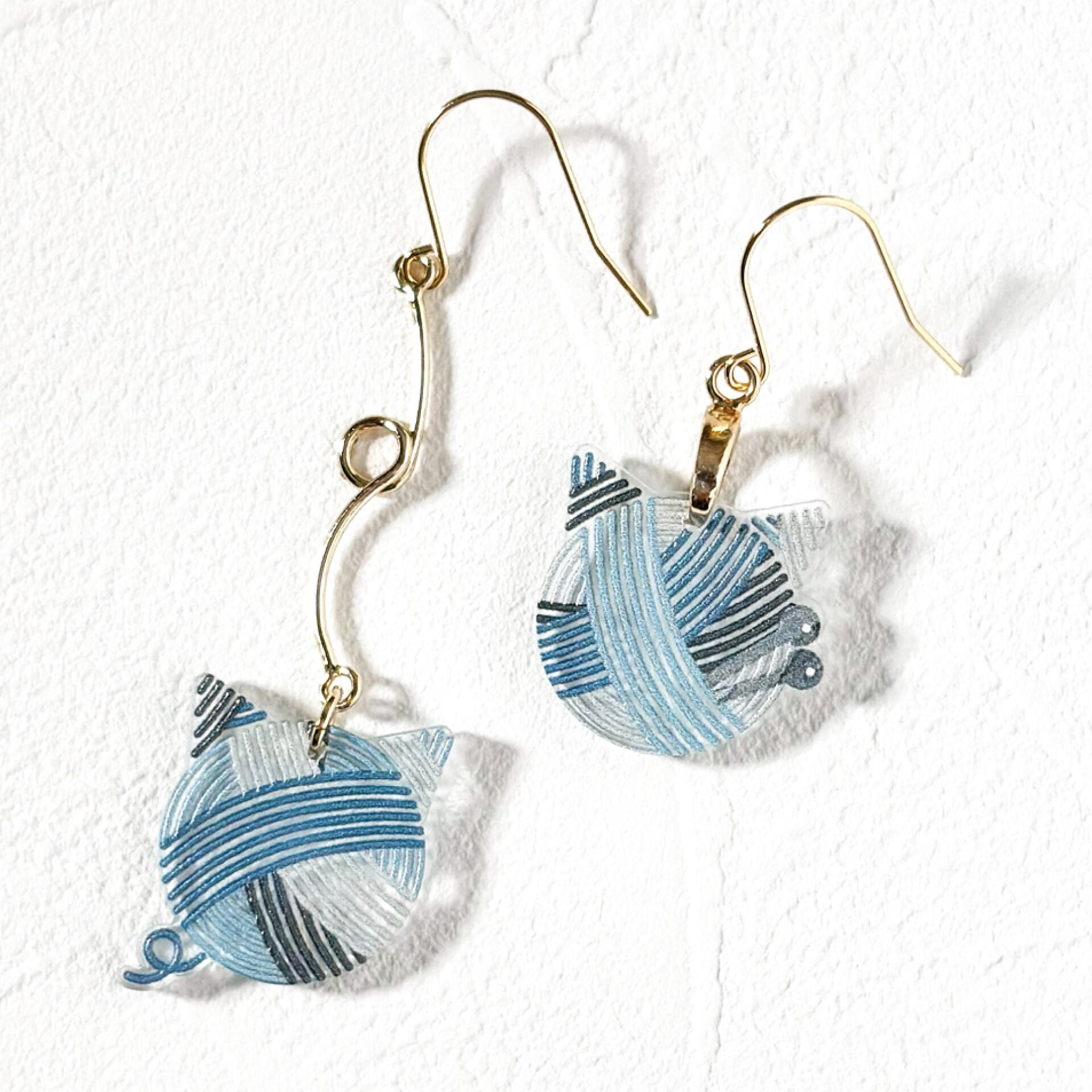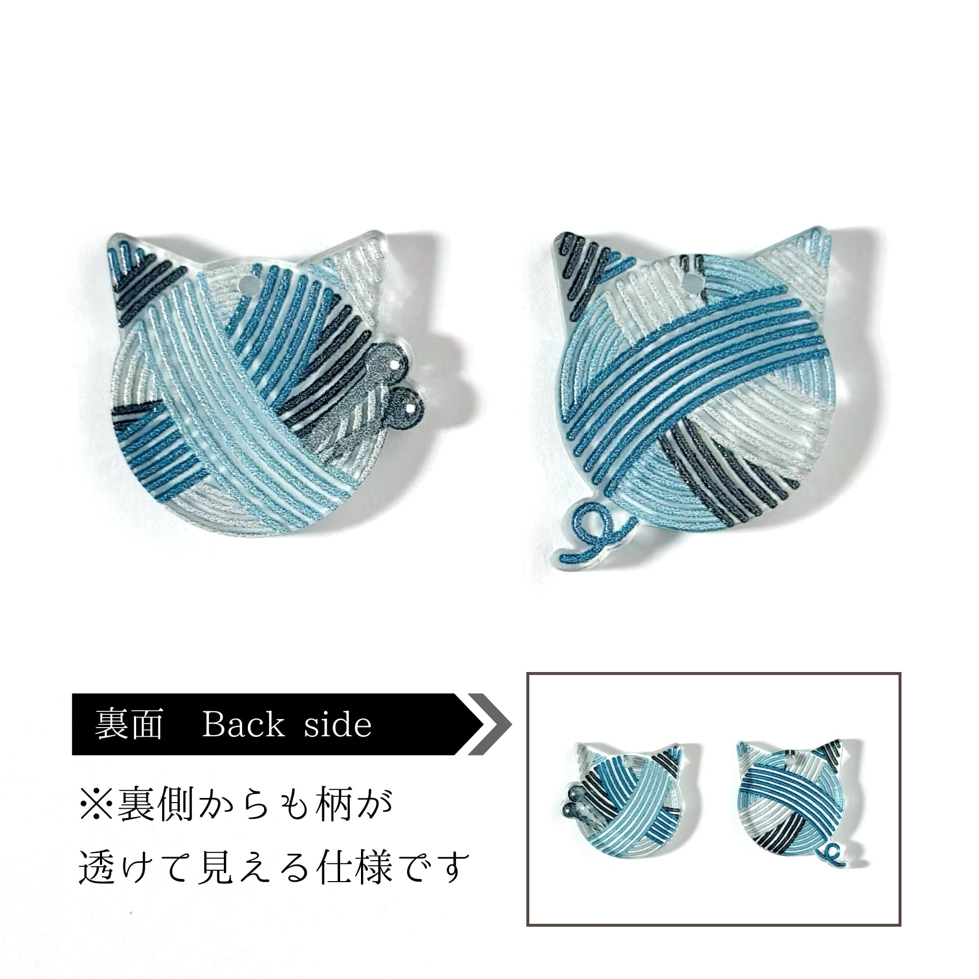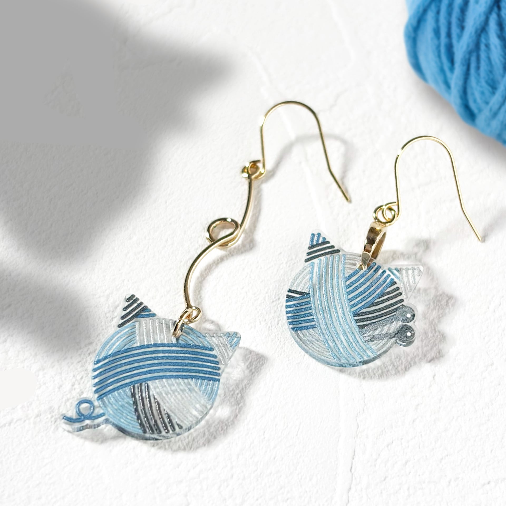 猫のシルエットの毛糸玉をアクセサリーにしました。片方には編み棒が添えられているなど、左右で表情の異なるデザイン。
