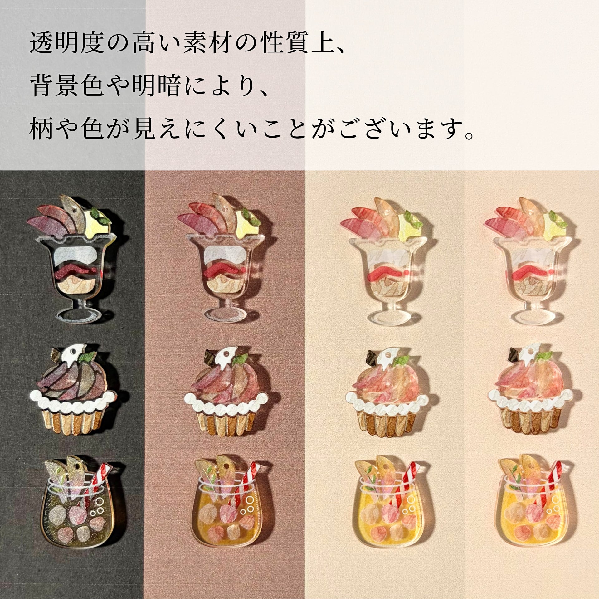 透明感のあるアクリル素材と、ピンク・オレンジ・イエローの淡いグラデーションで、桃の瑞々しさや果肉のジューシーさをフルーティーに表現しています。