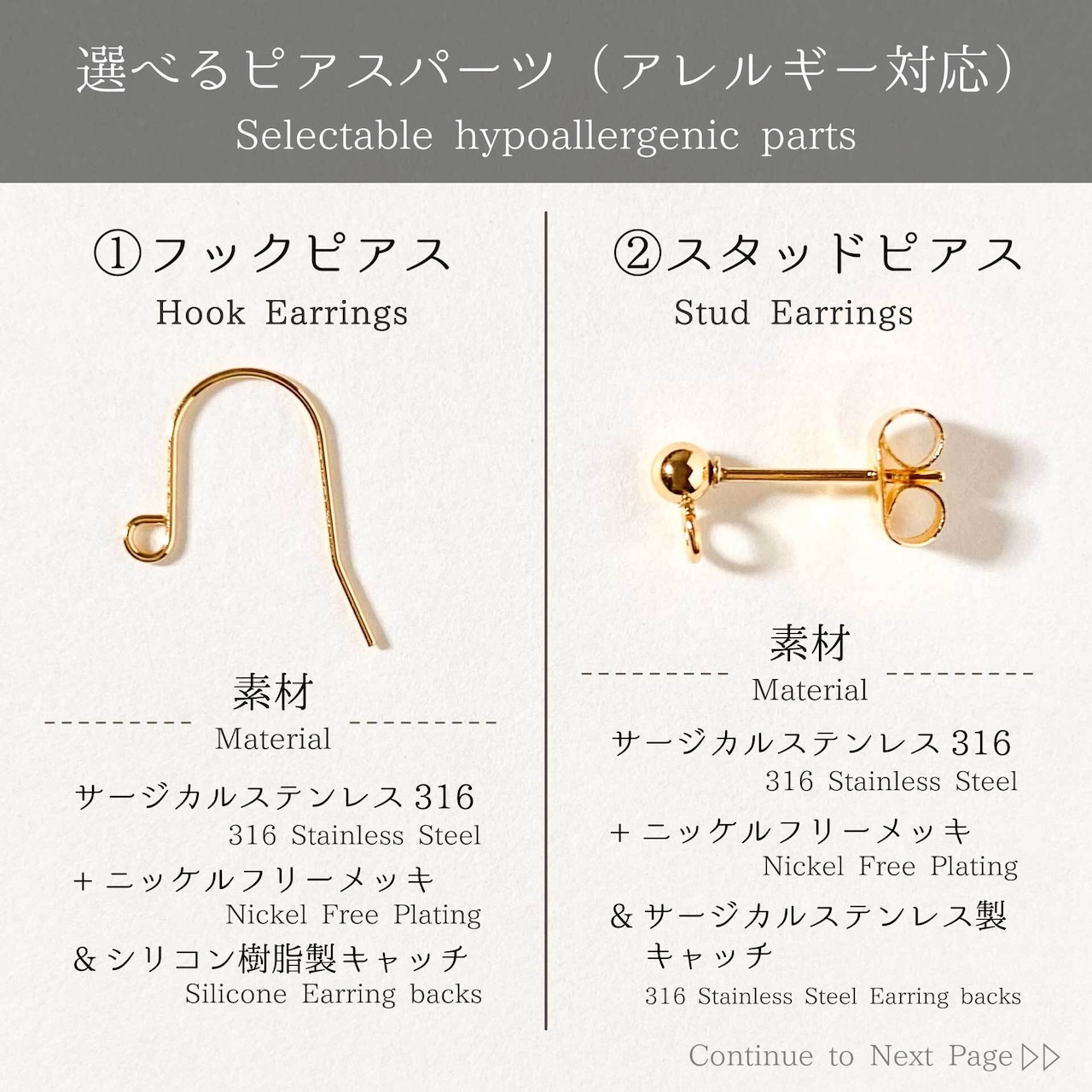 ご購入の際は、以下の5種類からピアス部分のパーツを選択できます。