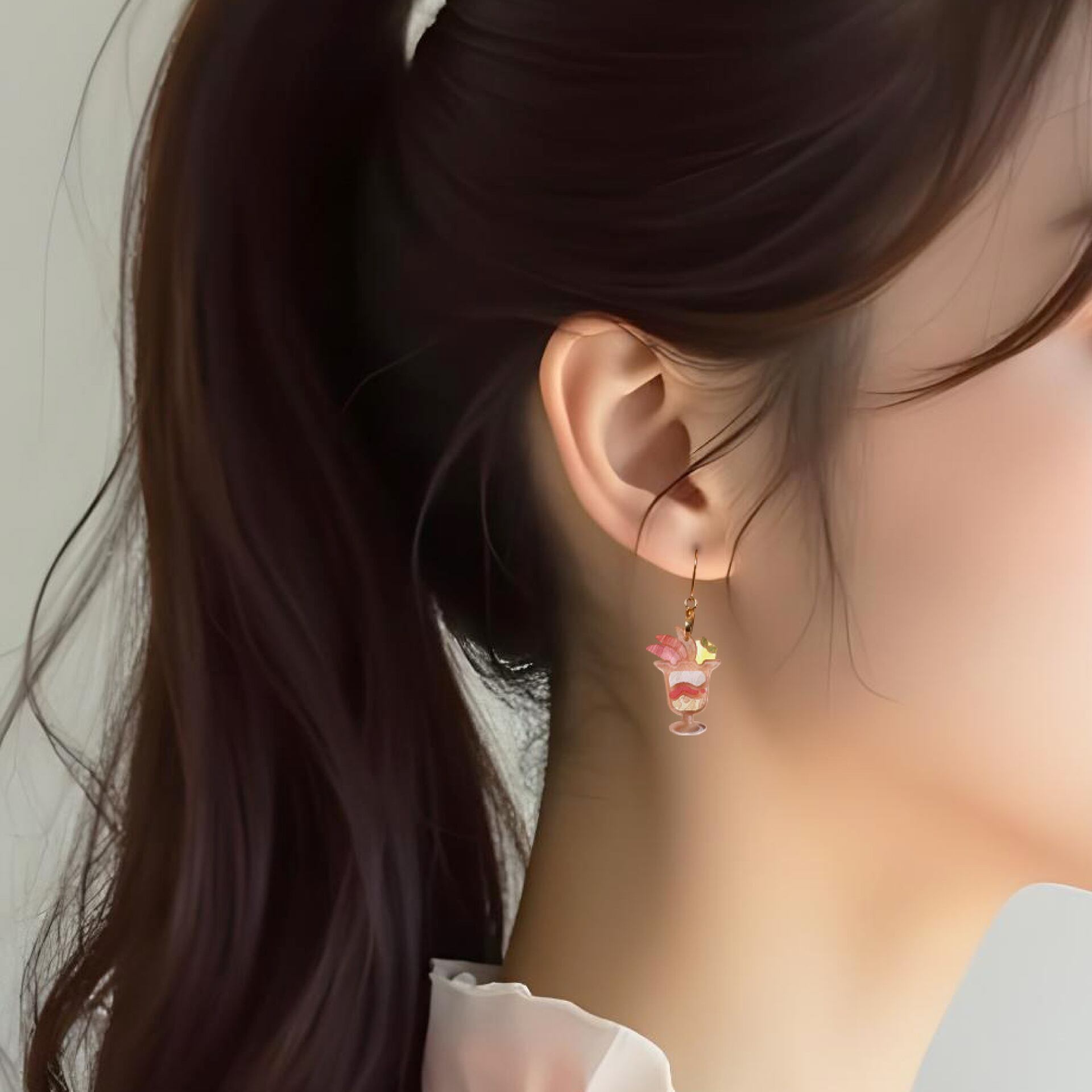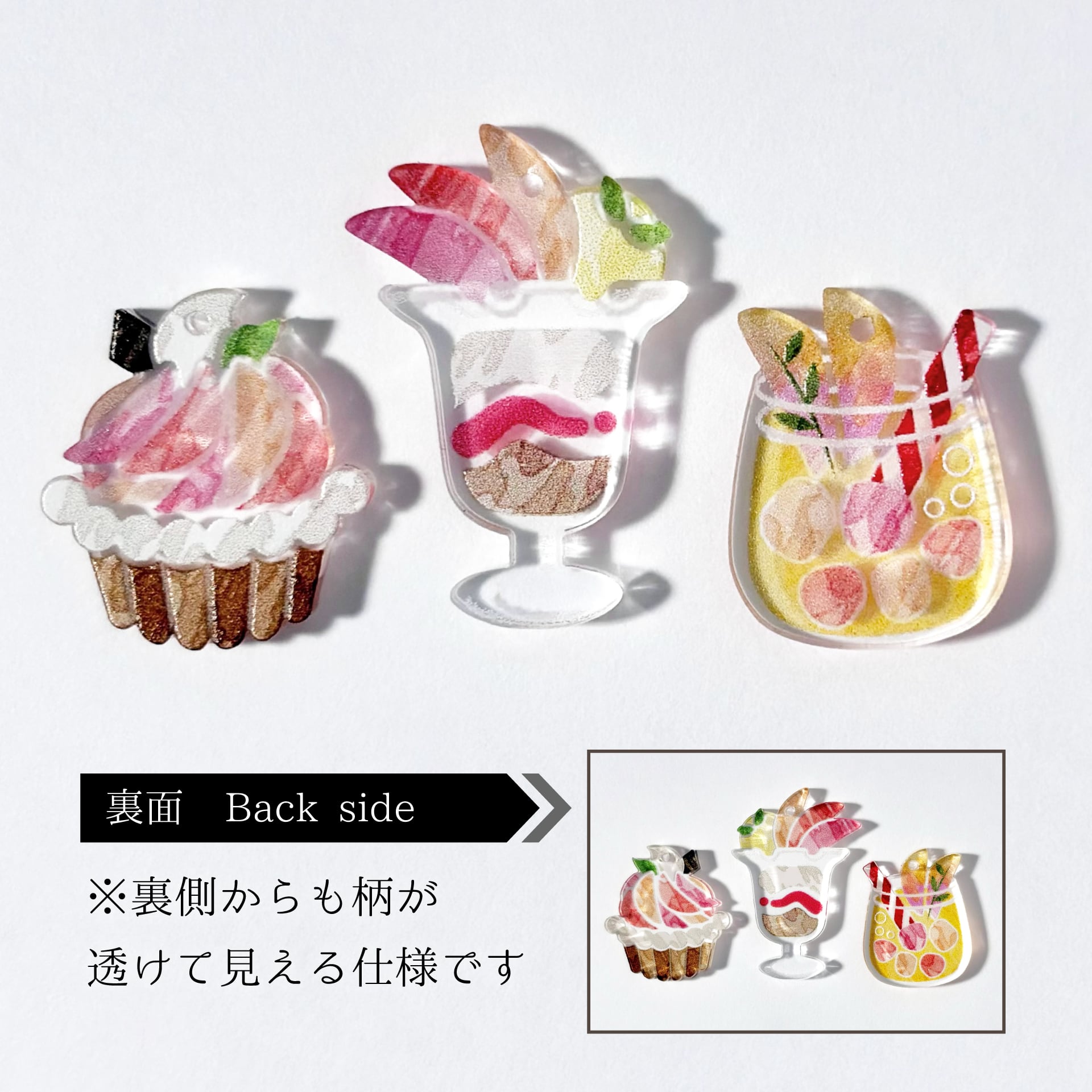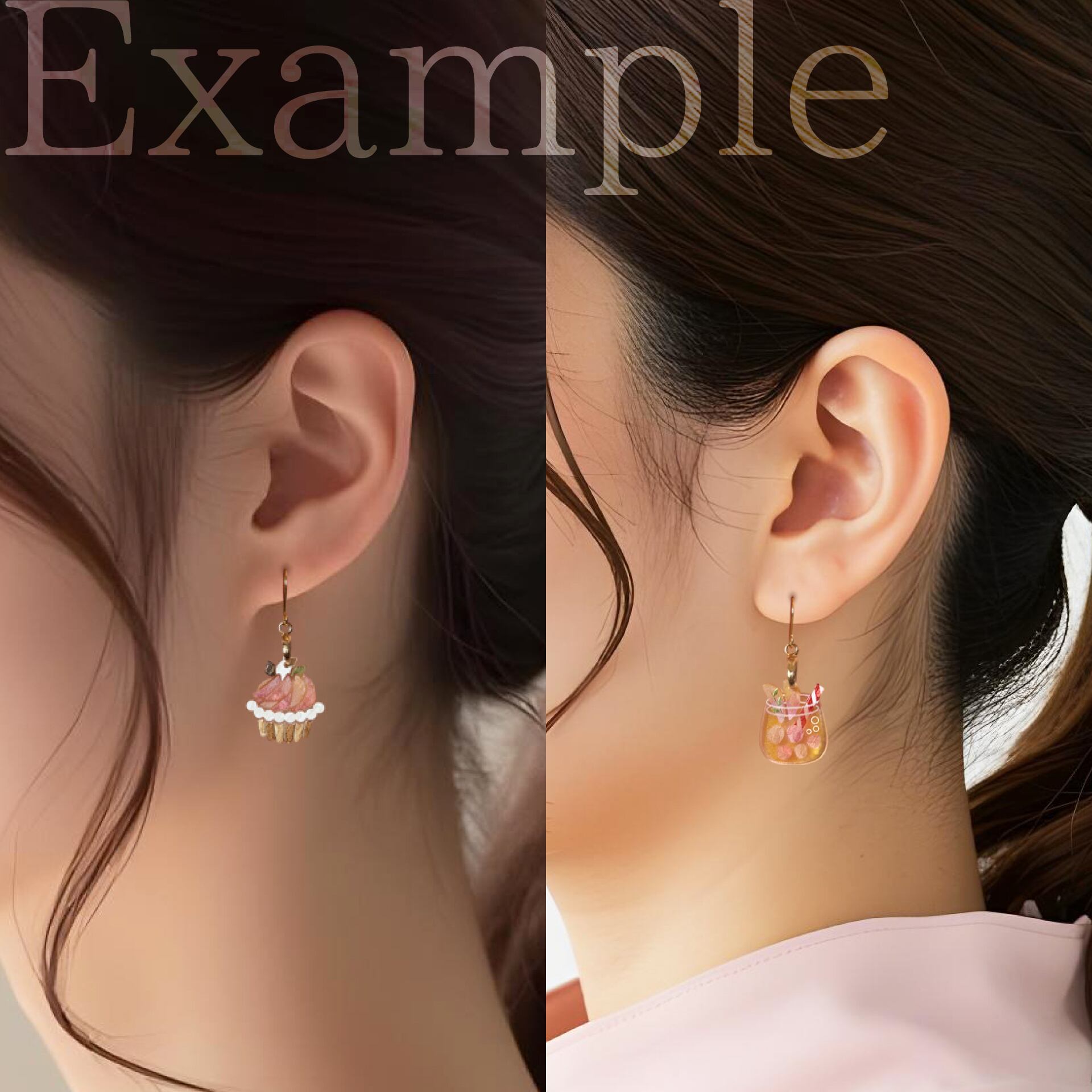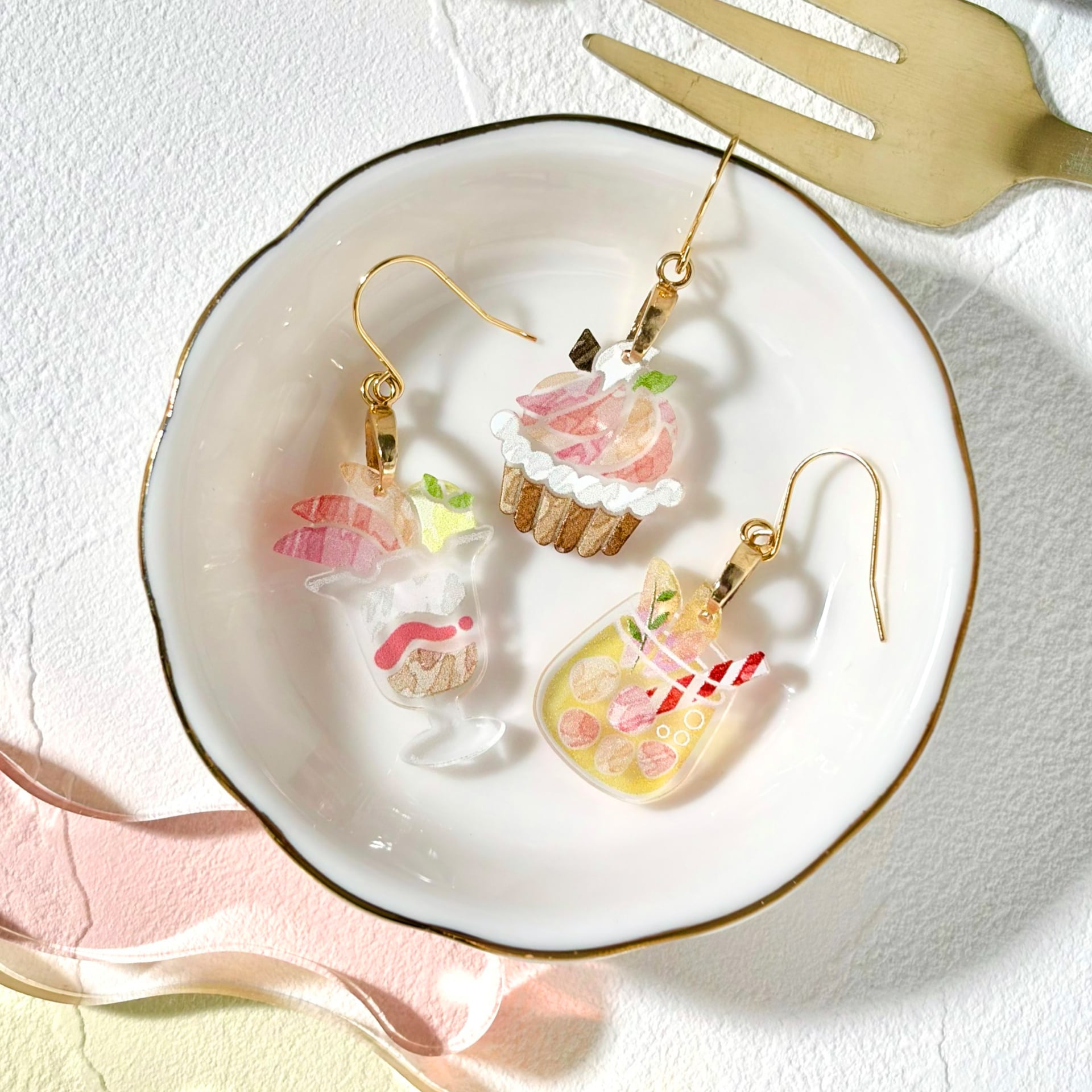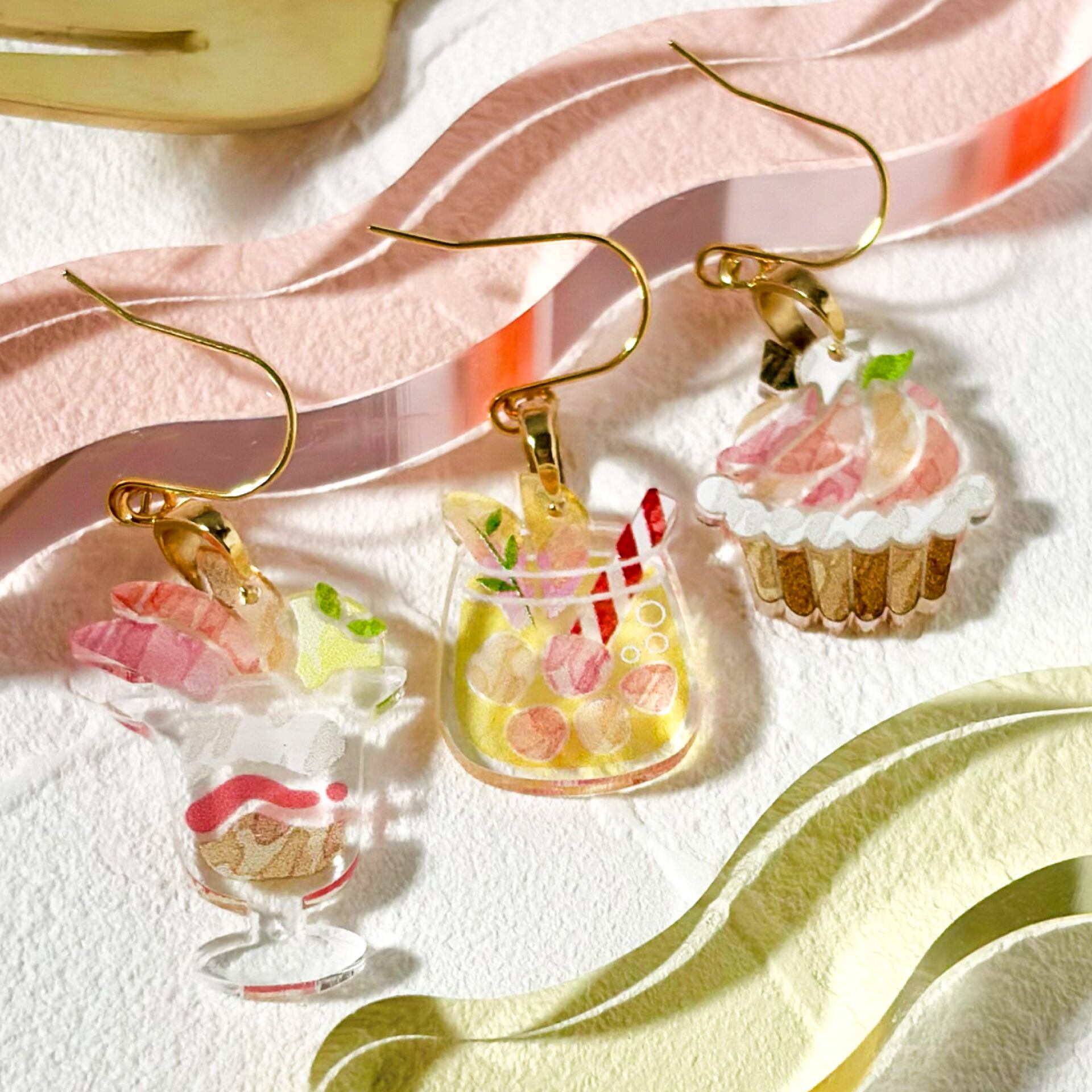 パフェ・ジュース・タルトの3種類を楽しめる耳飾りです。