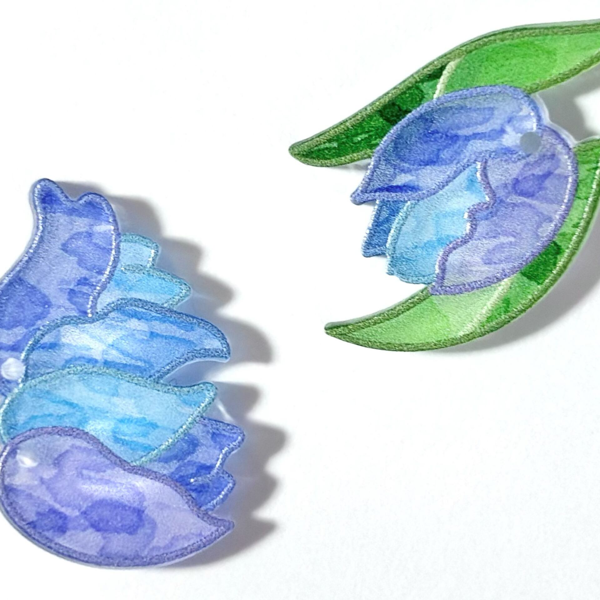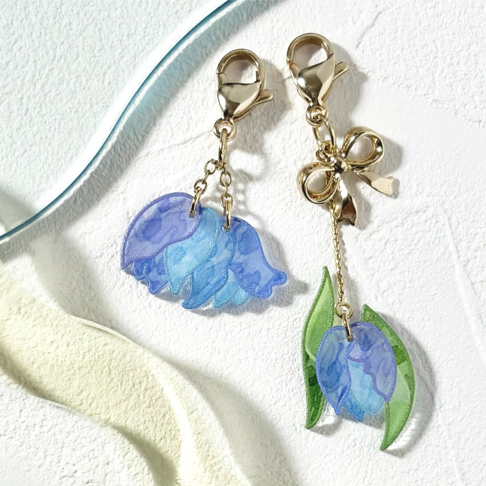 片側はリボンを添えた一輪ブーケのようなチューリップ、もう片側は二輪の花がチェーンで揺れるデザイン。それぞれ異なるデザインが可愛いチャームです。