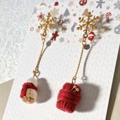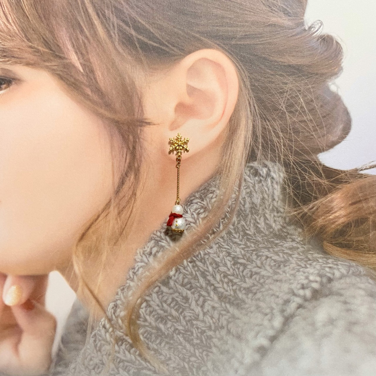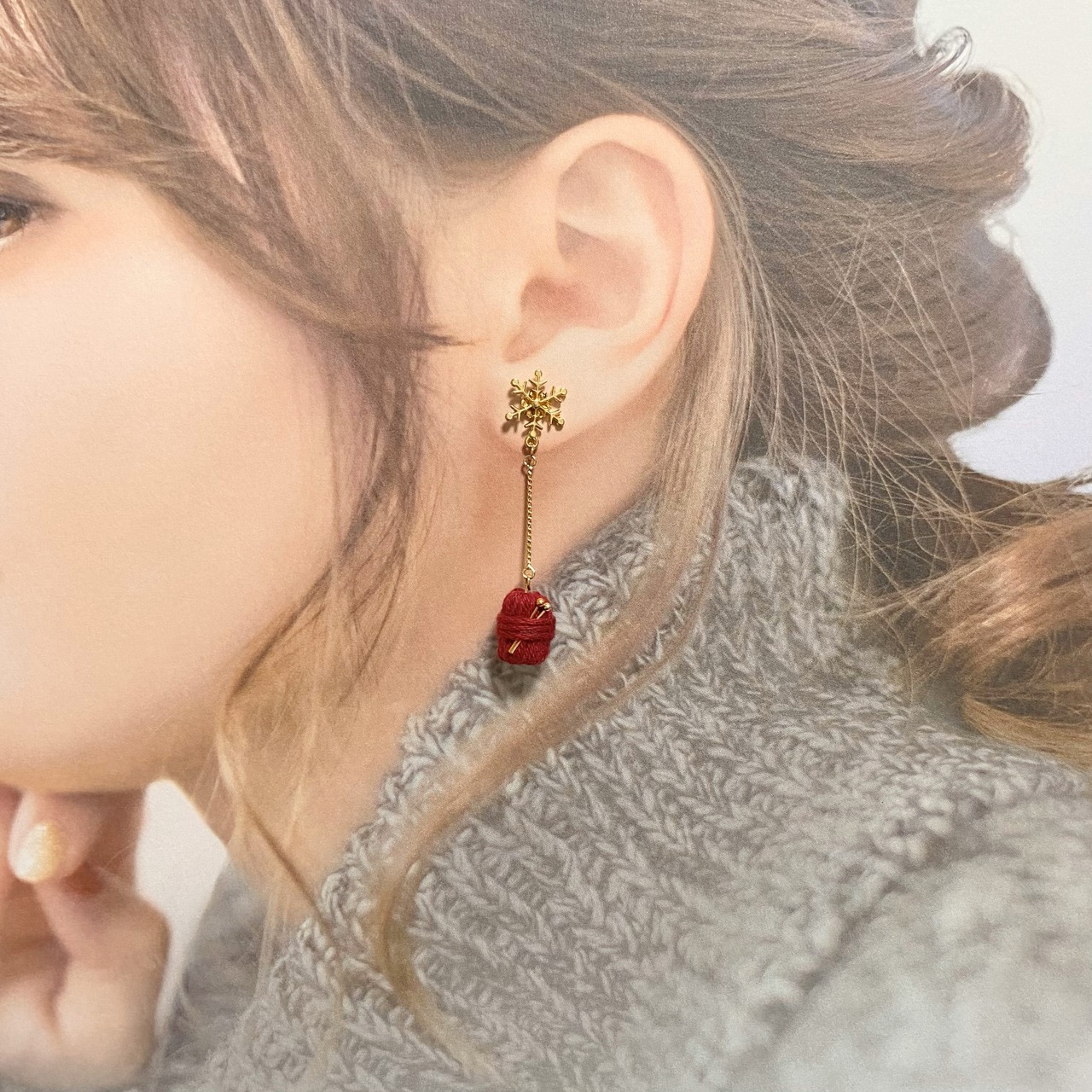 毛糸玉には編み棒が添えられており、誰かが雪だるまのためにマフラーを編んだあとがうかがえるような、温かい冬の一日をイメージしたピアスができました。