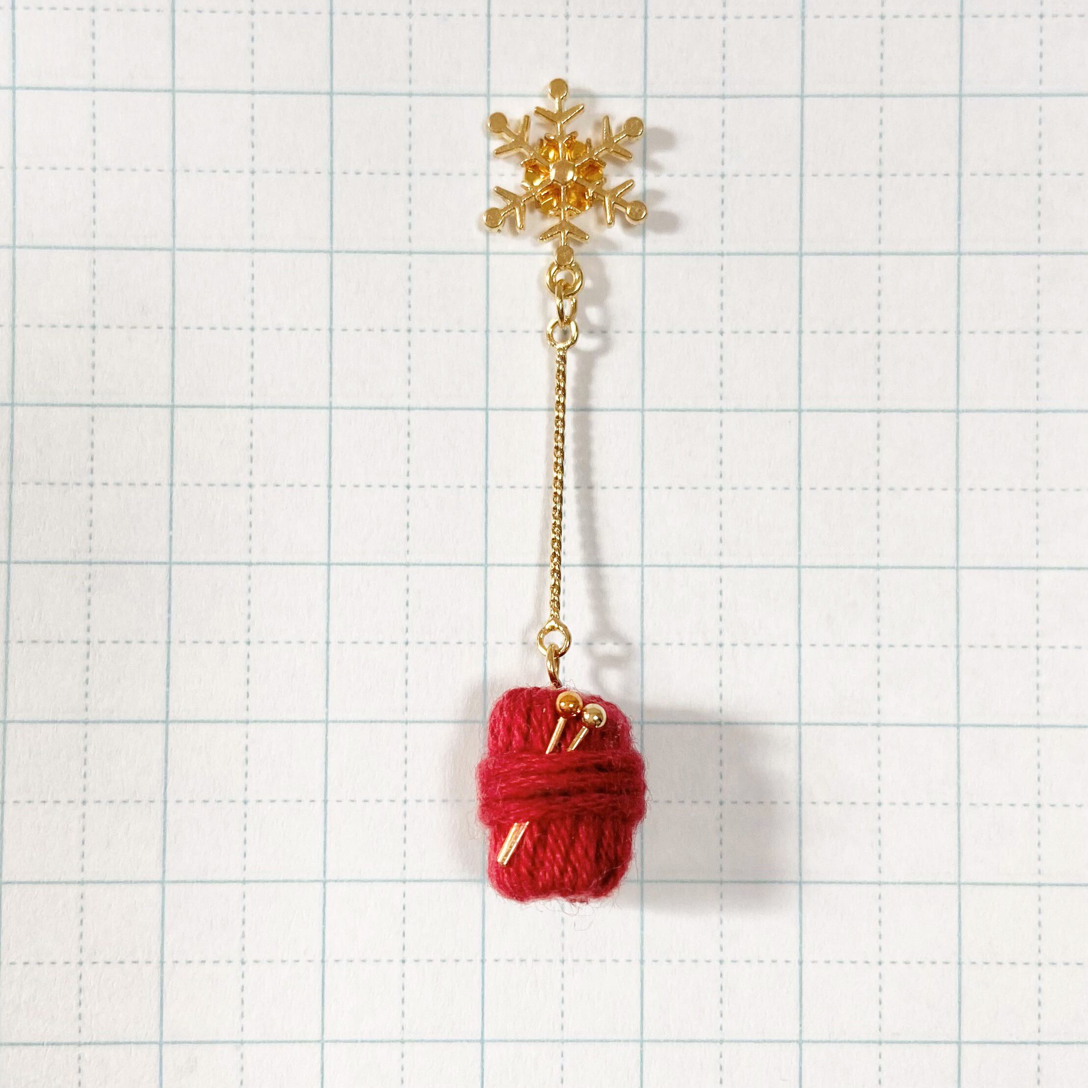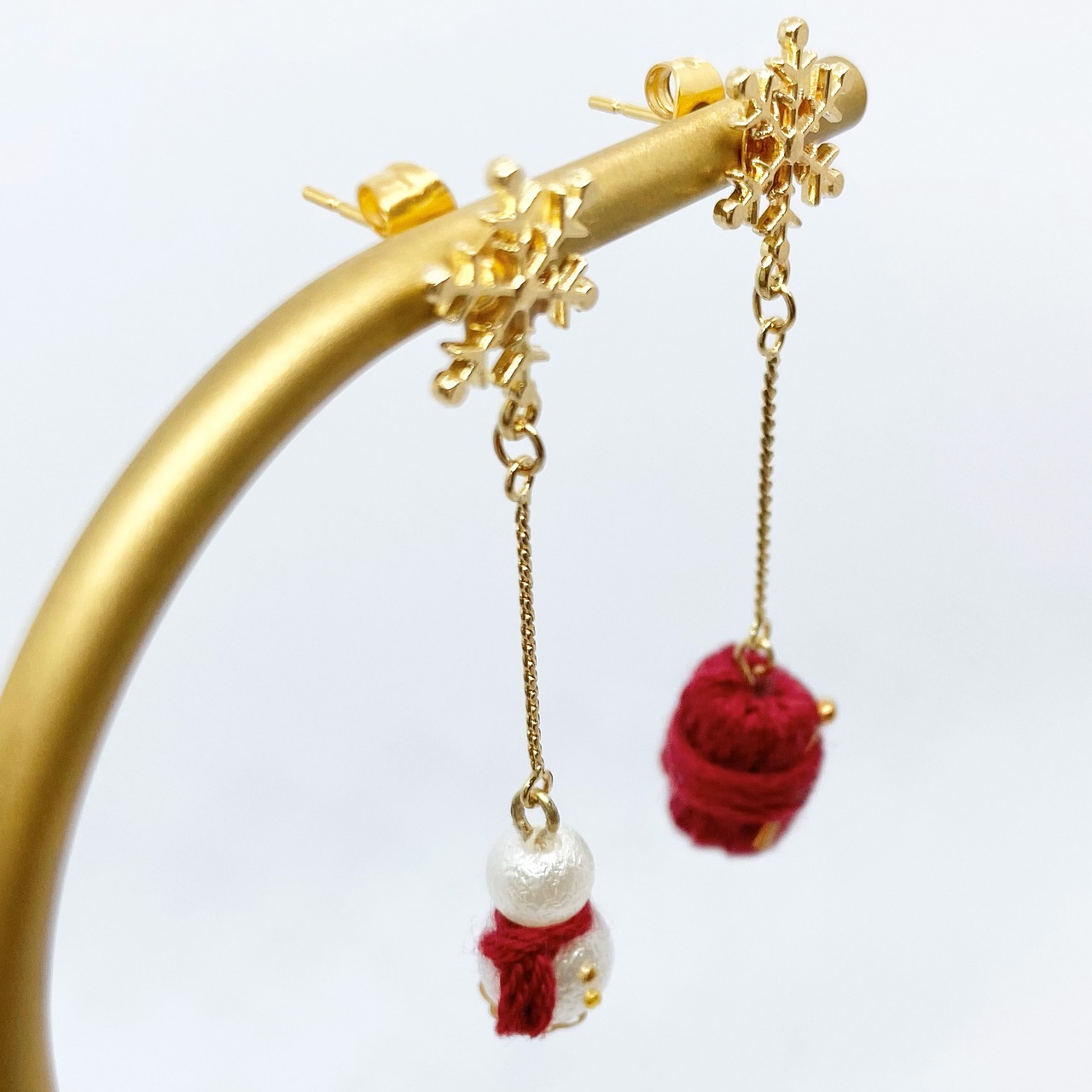 えんじ色の毛糸玉と、同じ色のマフラーを巻いた雪だるまのピアス。