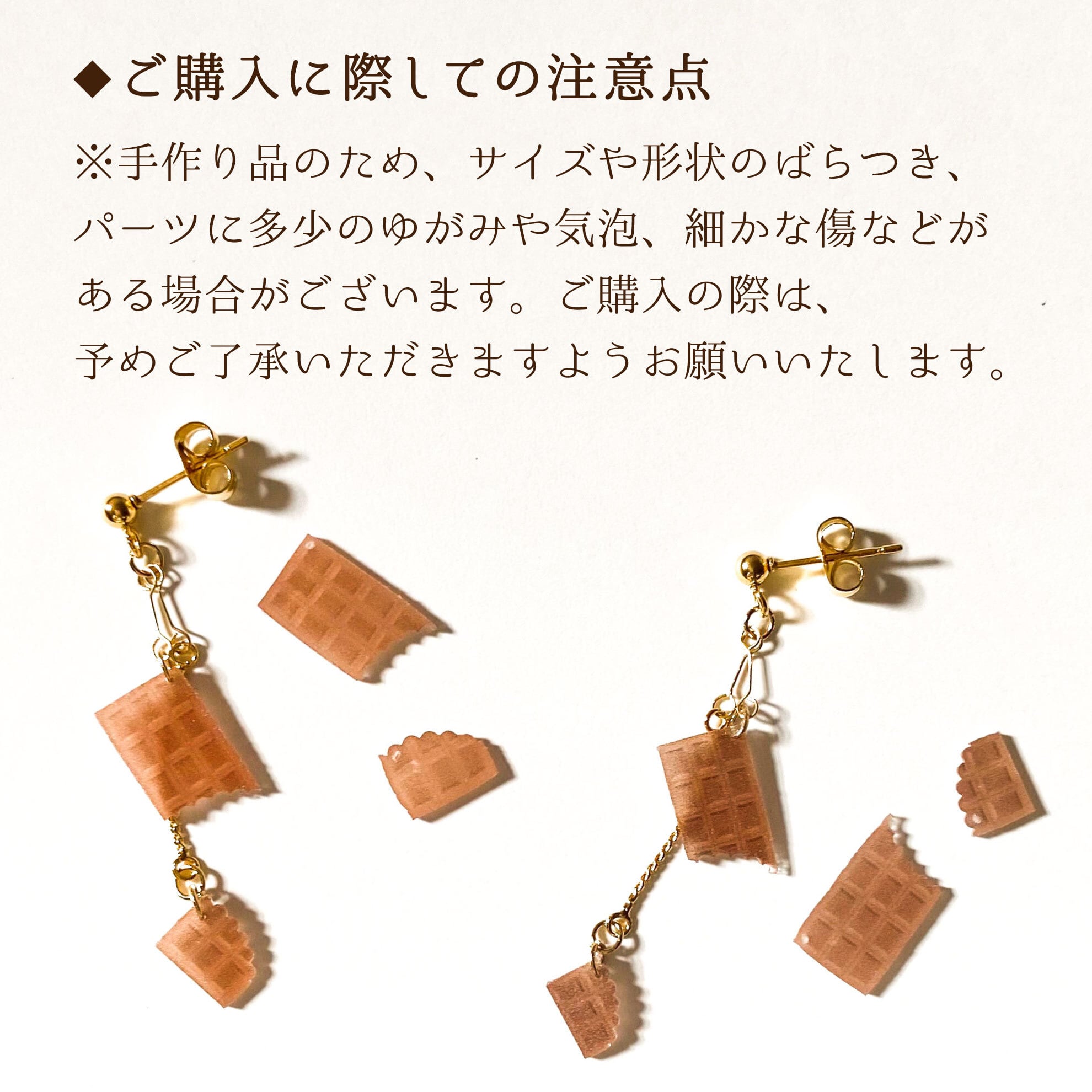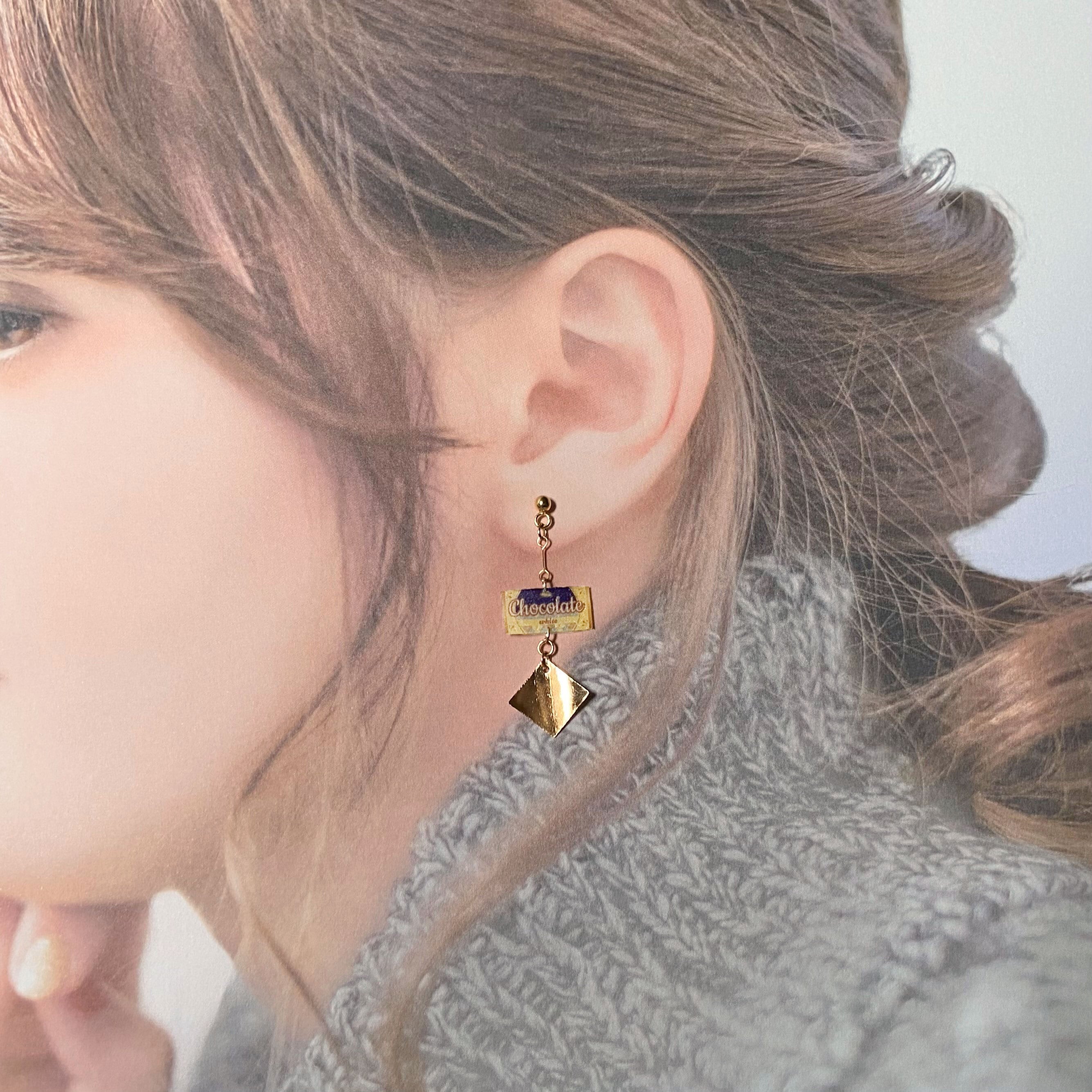 もう片方は、ひとかじりした板チョコと、その欠片が揺れるデザインのピアスです。