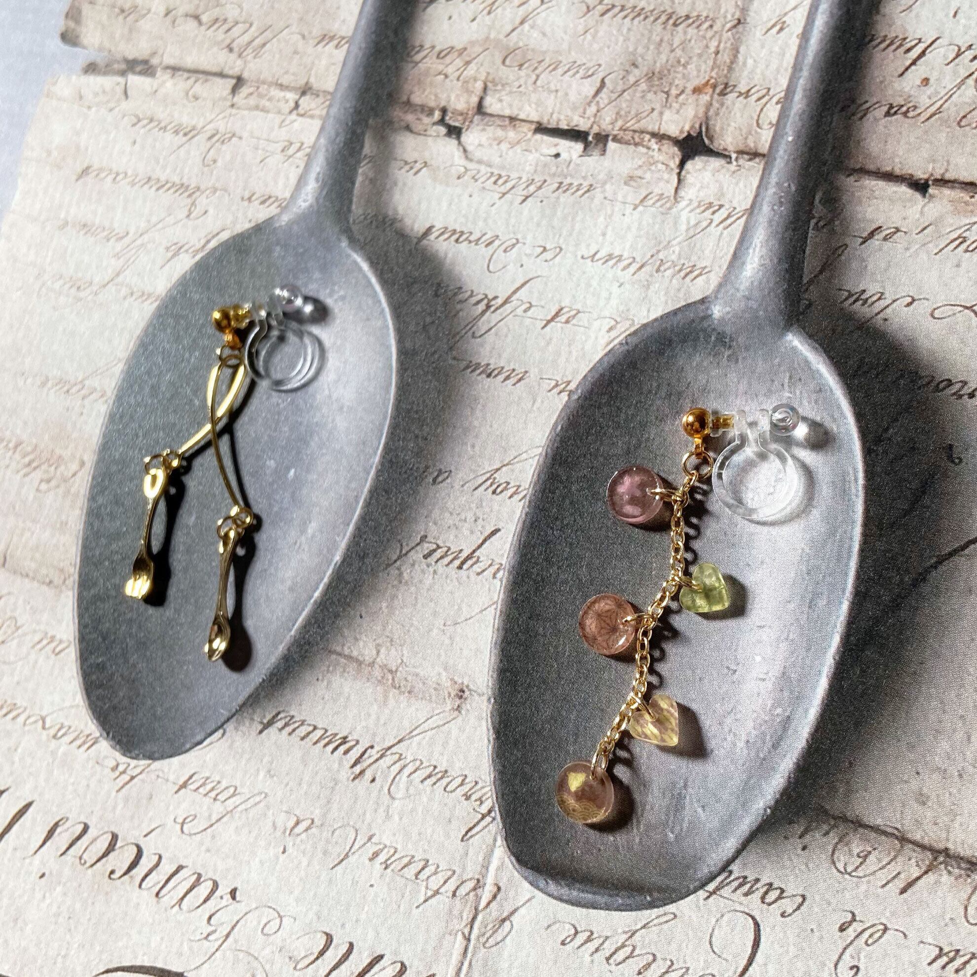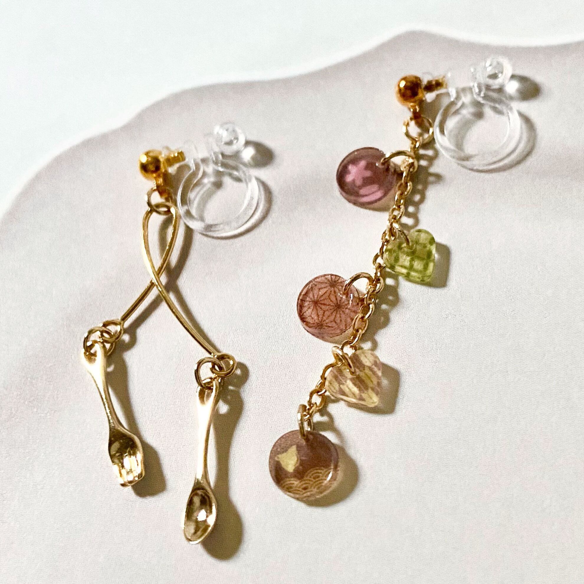 5種類のアソートチョコレートが、チェーンでゆらゆら繋がったピアスです。