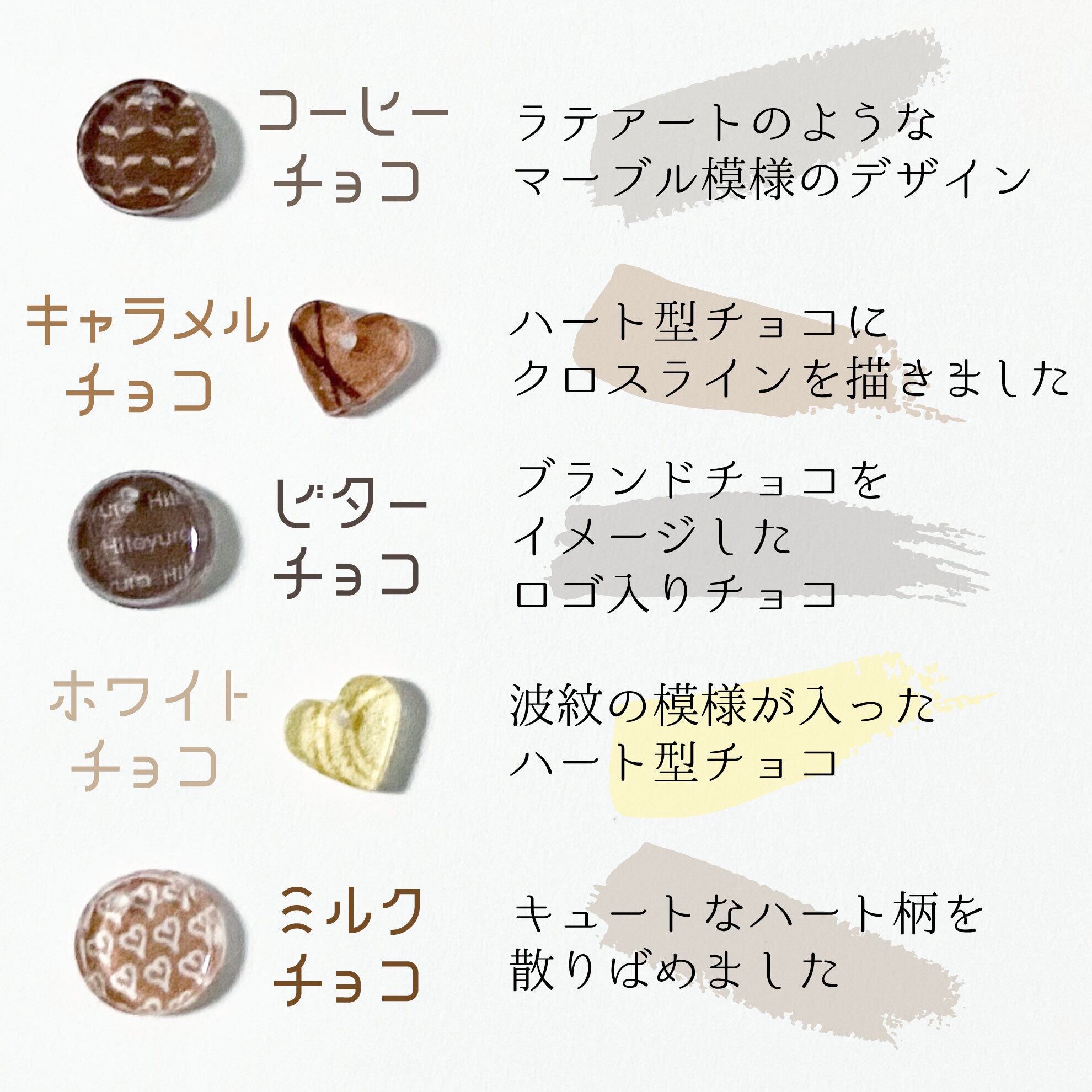 アソートチョコレートは、それぞれデザインと味の違う5種類をイメージしています。