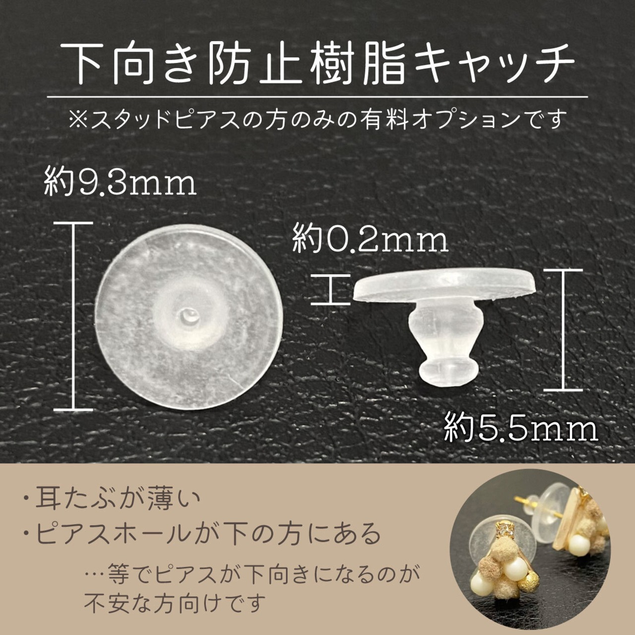 耳たぶが薄かったり、ピアスの穴が下の方に開いていてピアスの飾りが下に傾く方向けのキャッチです。