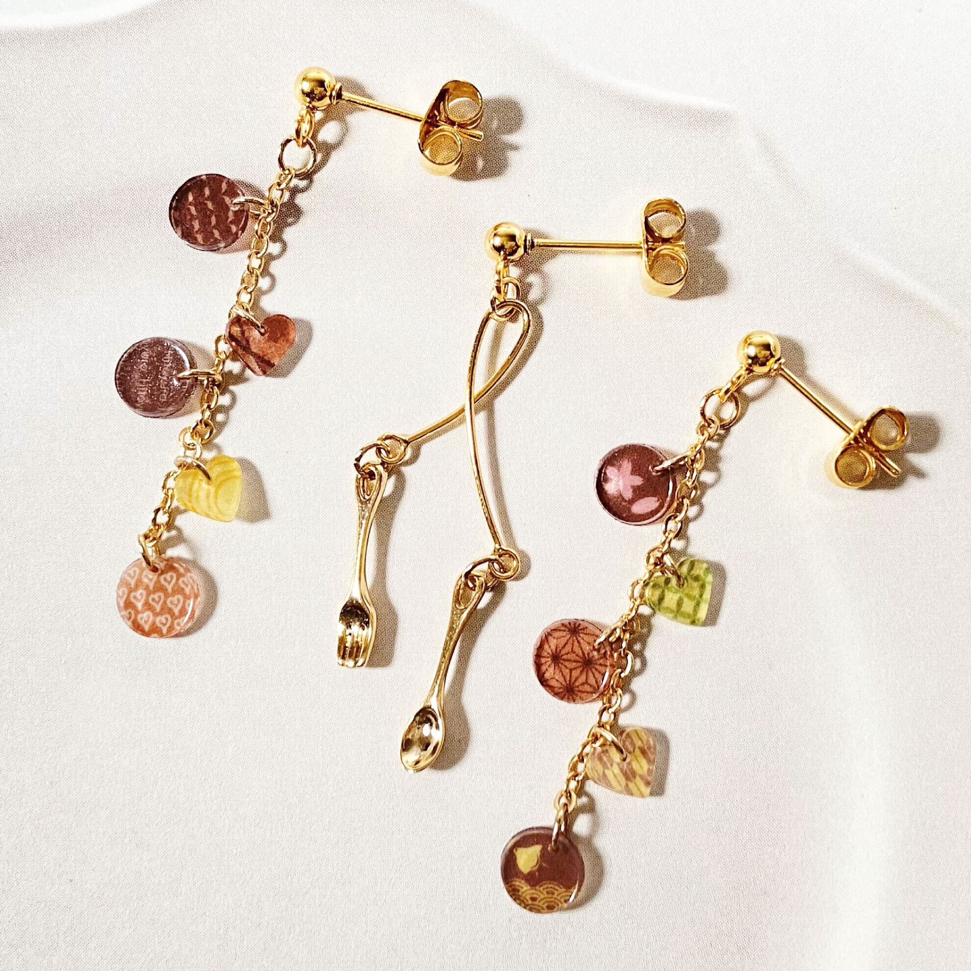 チョコレートを食べるためのスプーンやフォークが揺れるピアスもセットです。