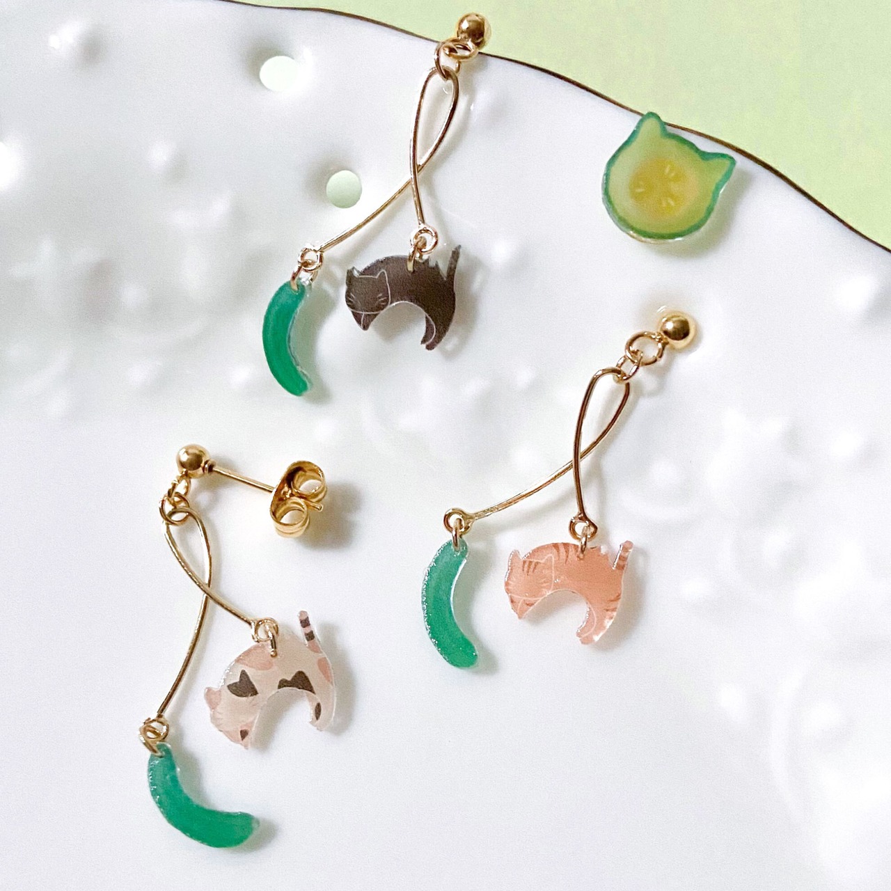 かわいいネコときゅうりのモチーフが目を引くピアス。