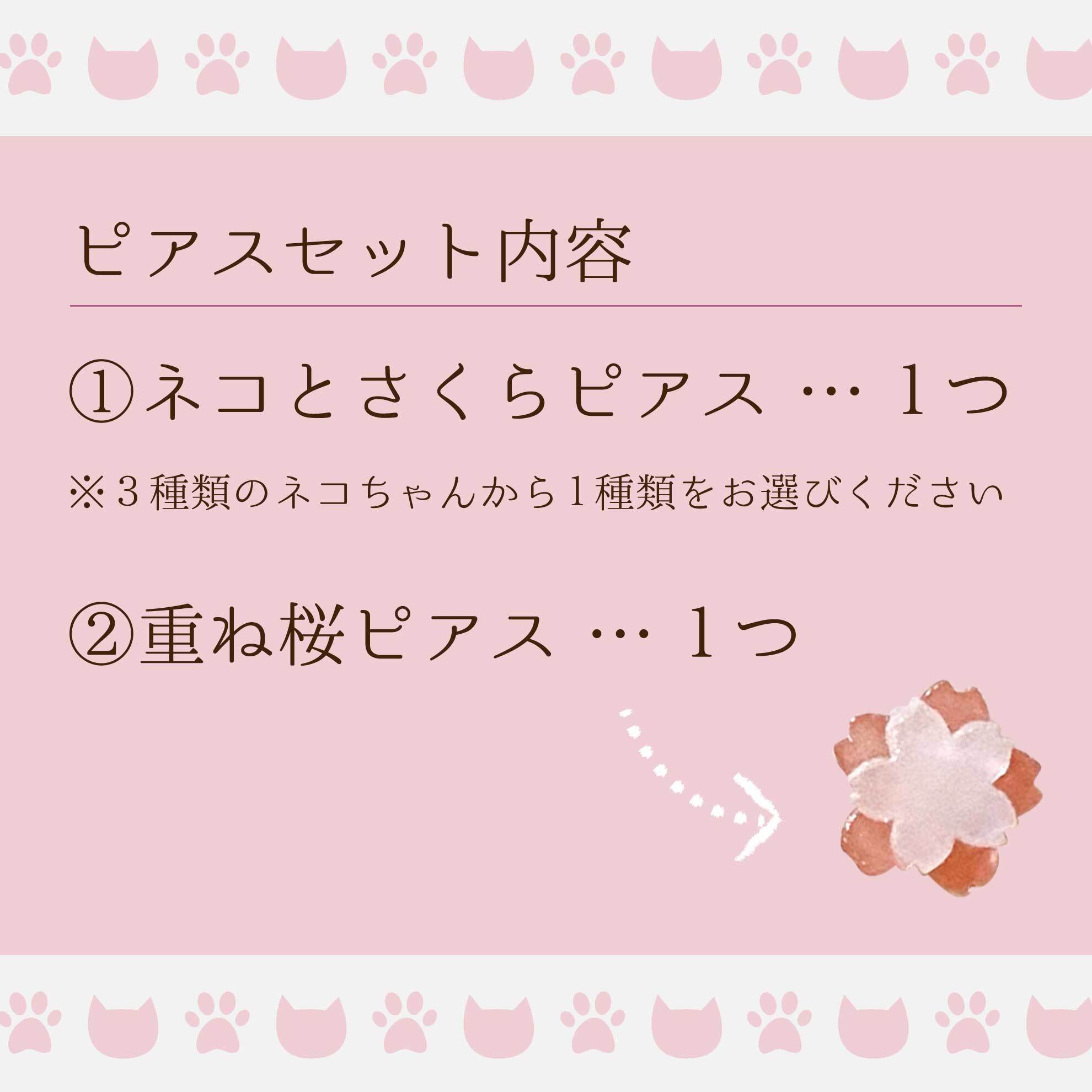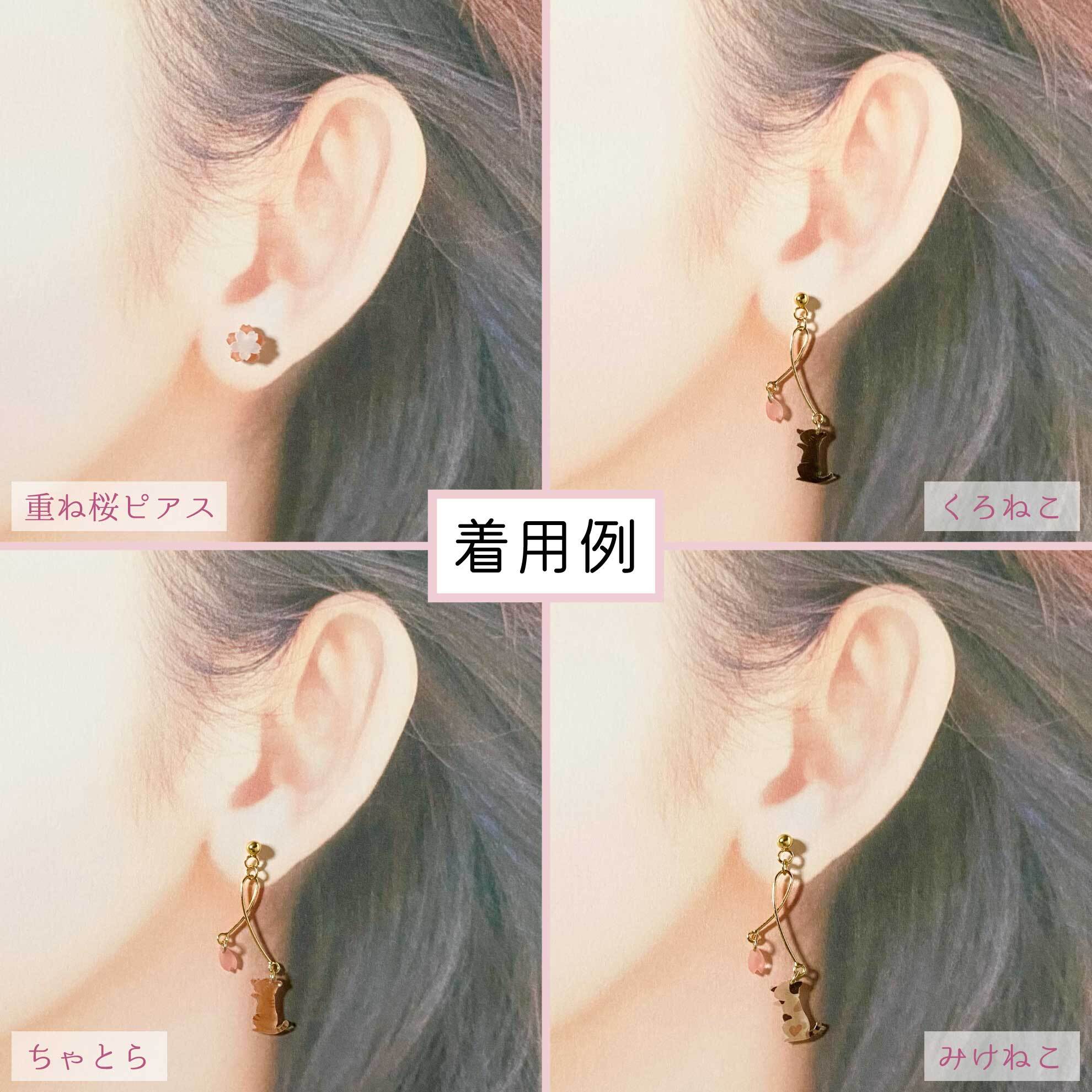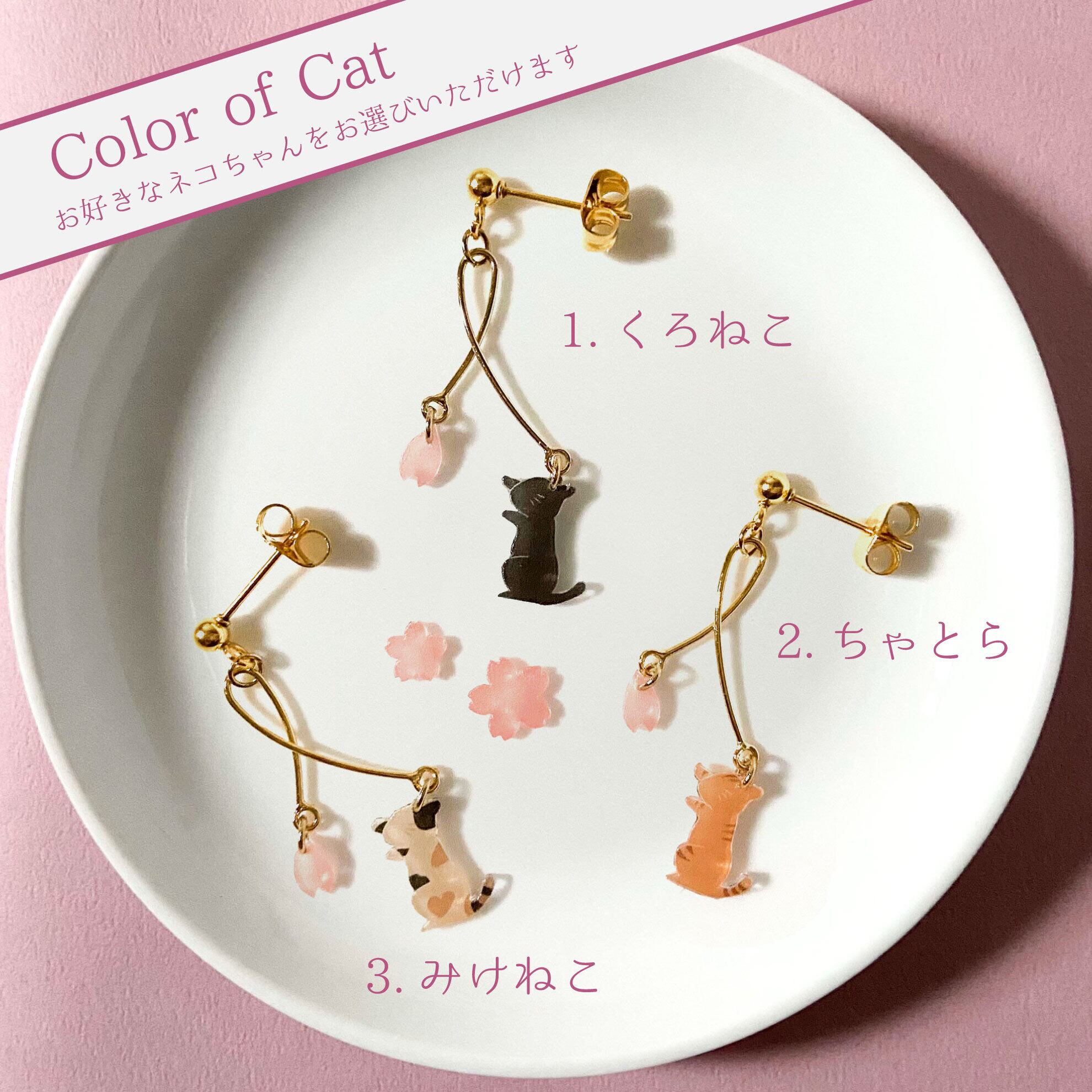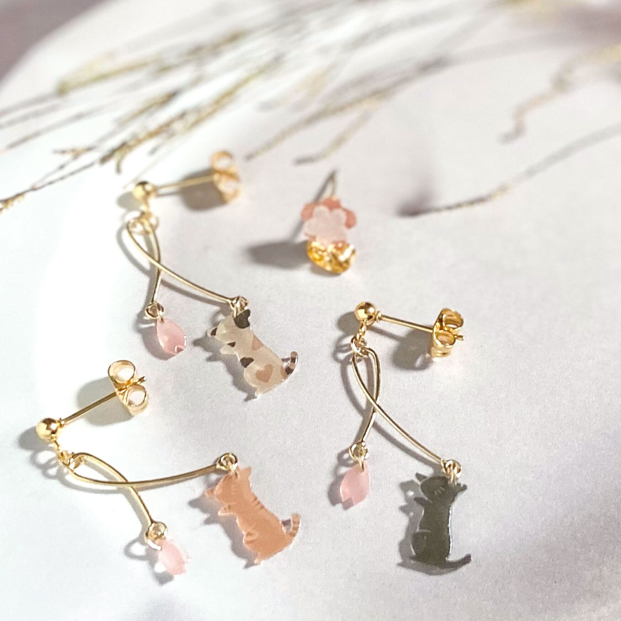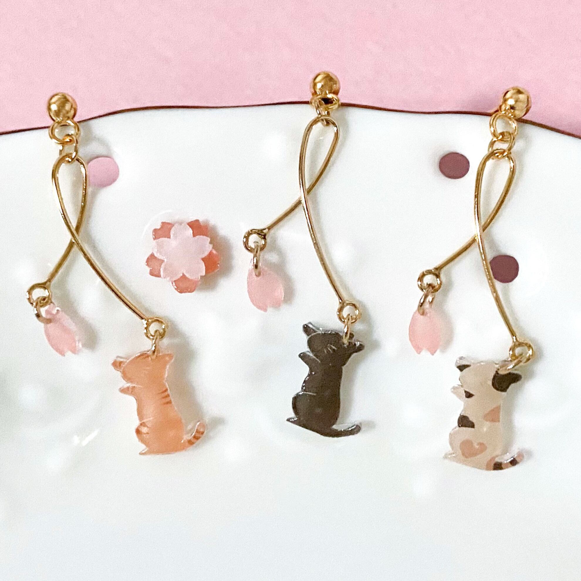 かわいいネコとひとひらの桜のモチーフがキュートなピアス。