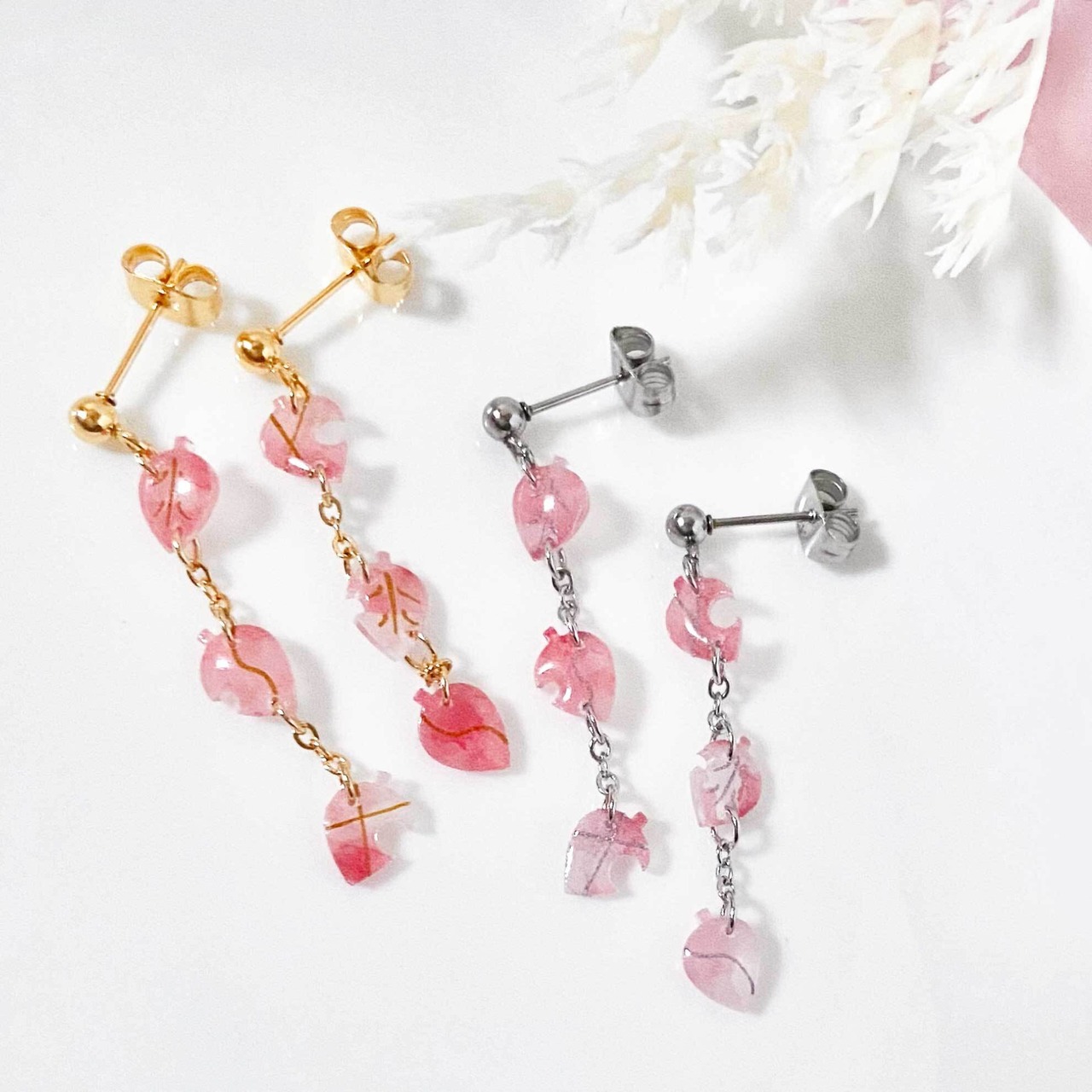 繊細なチェーンで繋いだ葉がひらりと揺れる様が楽しめる、季節を問わずお使いいただけるアクセサリーです。