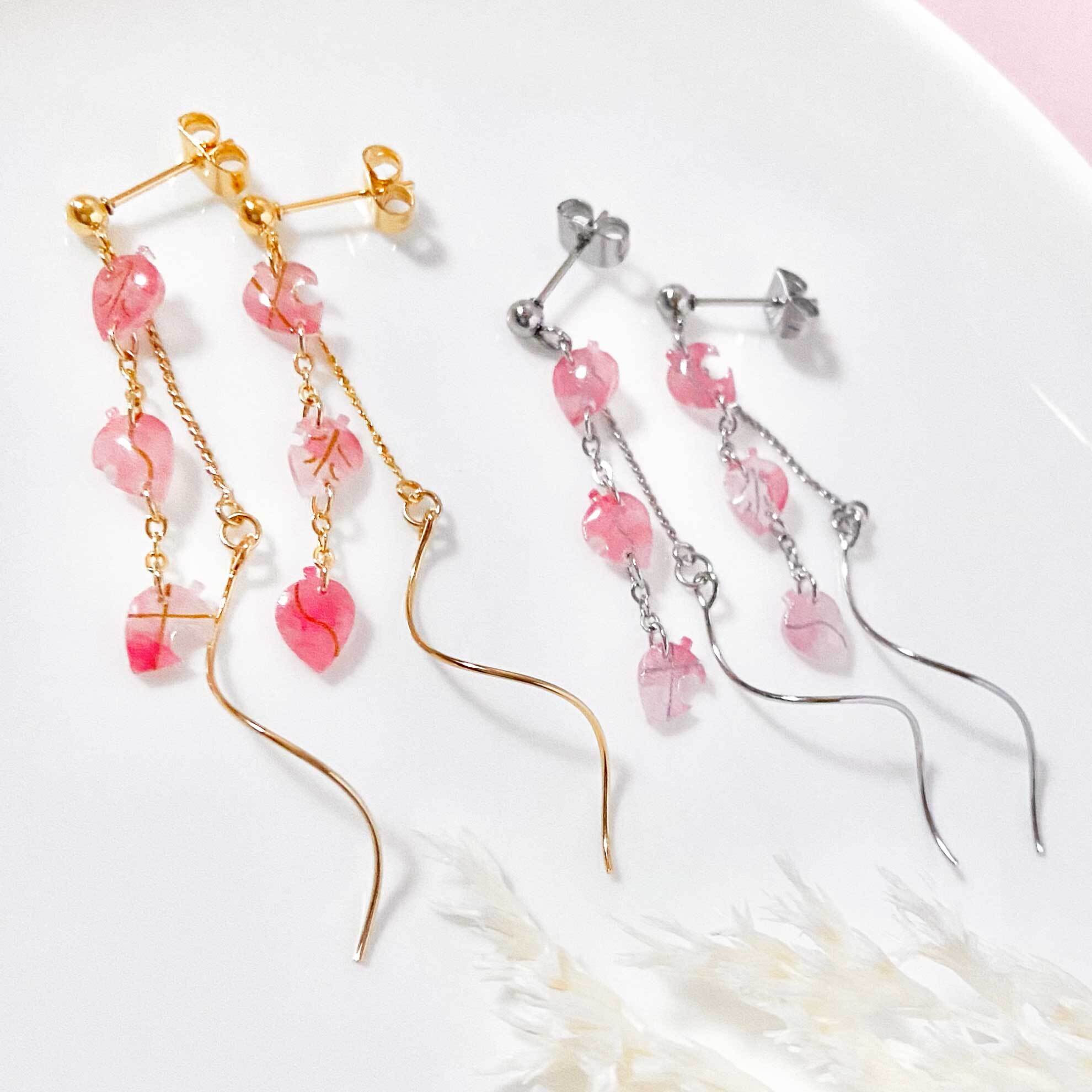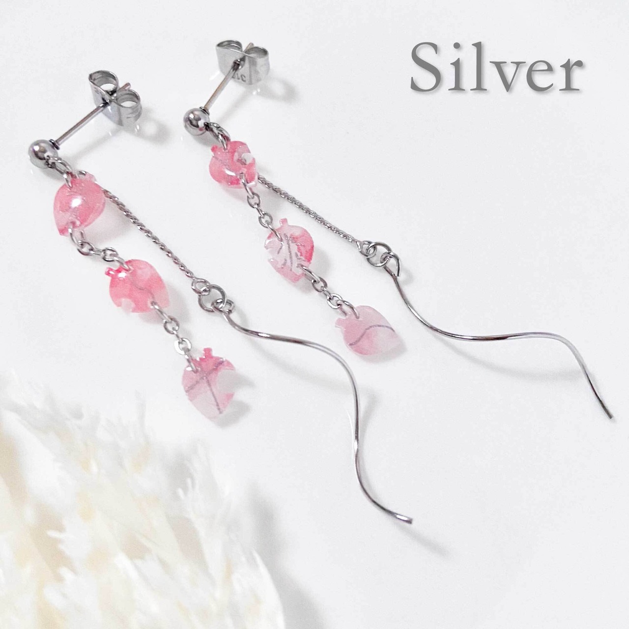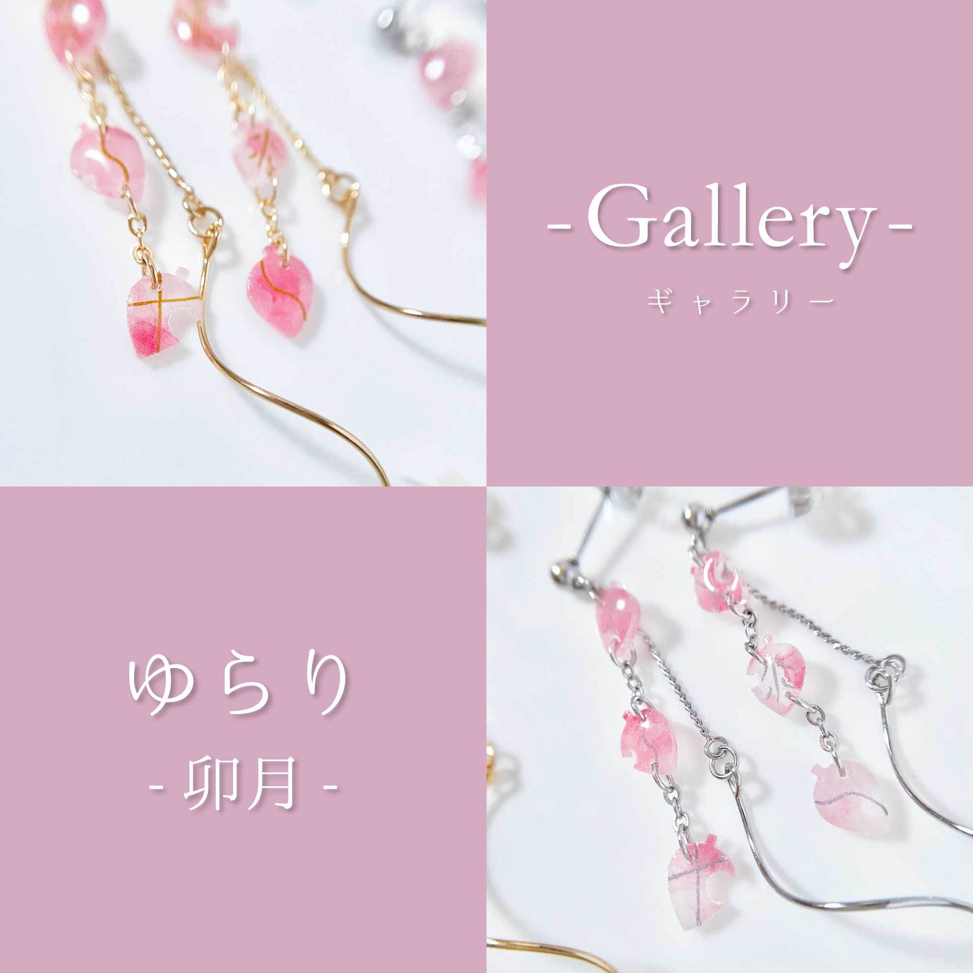 『ゆらり』は、葉が風に吹かれてゆらゆらと地面へ舞い落ちる軌跡をイメージしたウェーブパーツと、3連の葉が耳元を彩るピアスです。