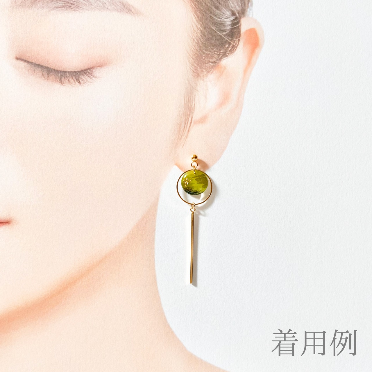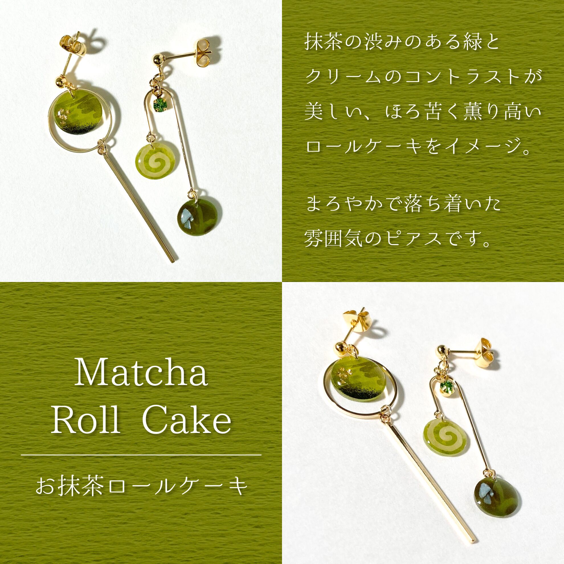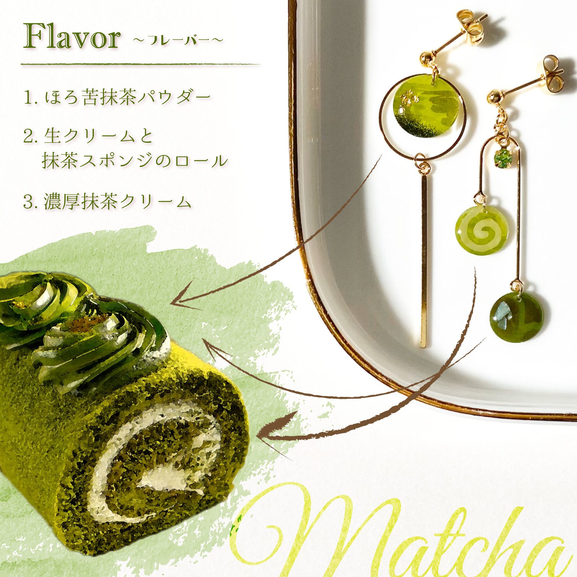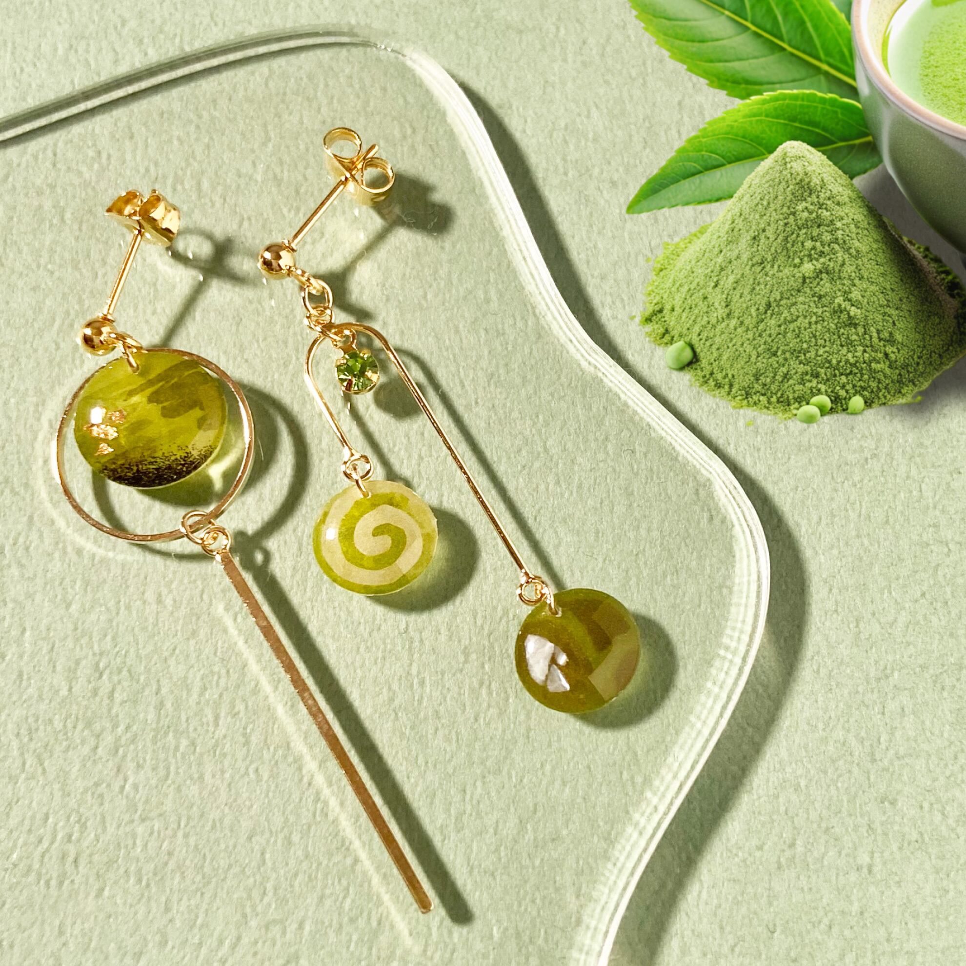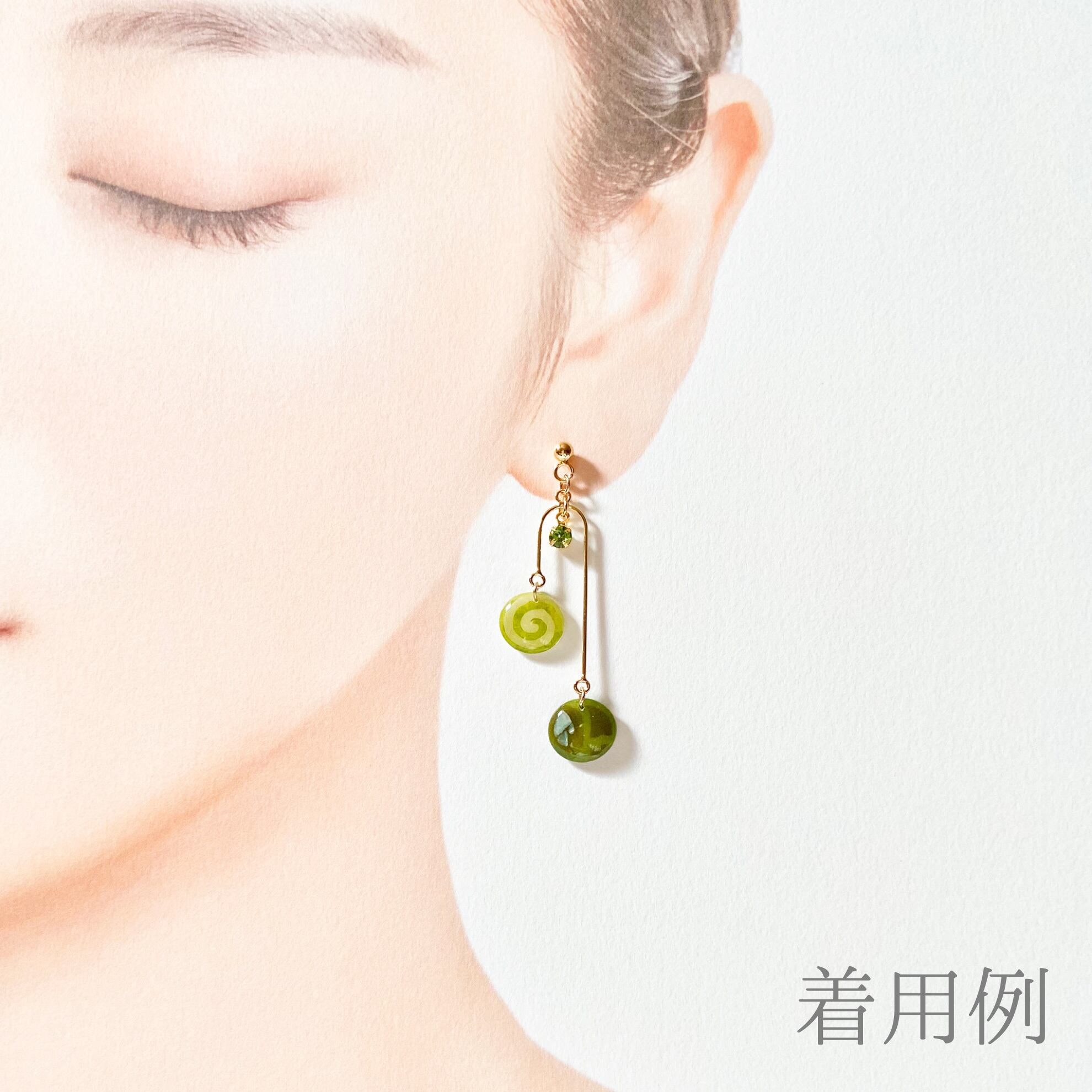 抹茶ロールケーキの層をイメージした3つのラウンド型パーツがゆらめき、深みグリーンが耳元を彩ります。