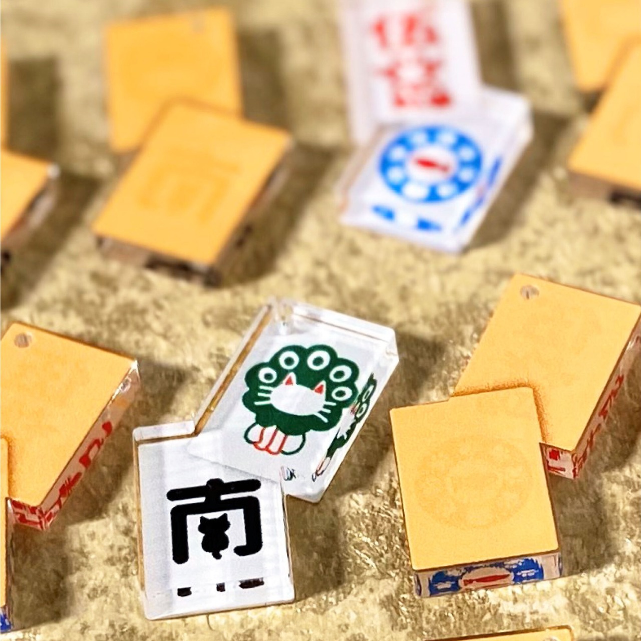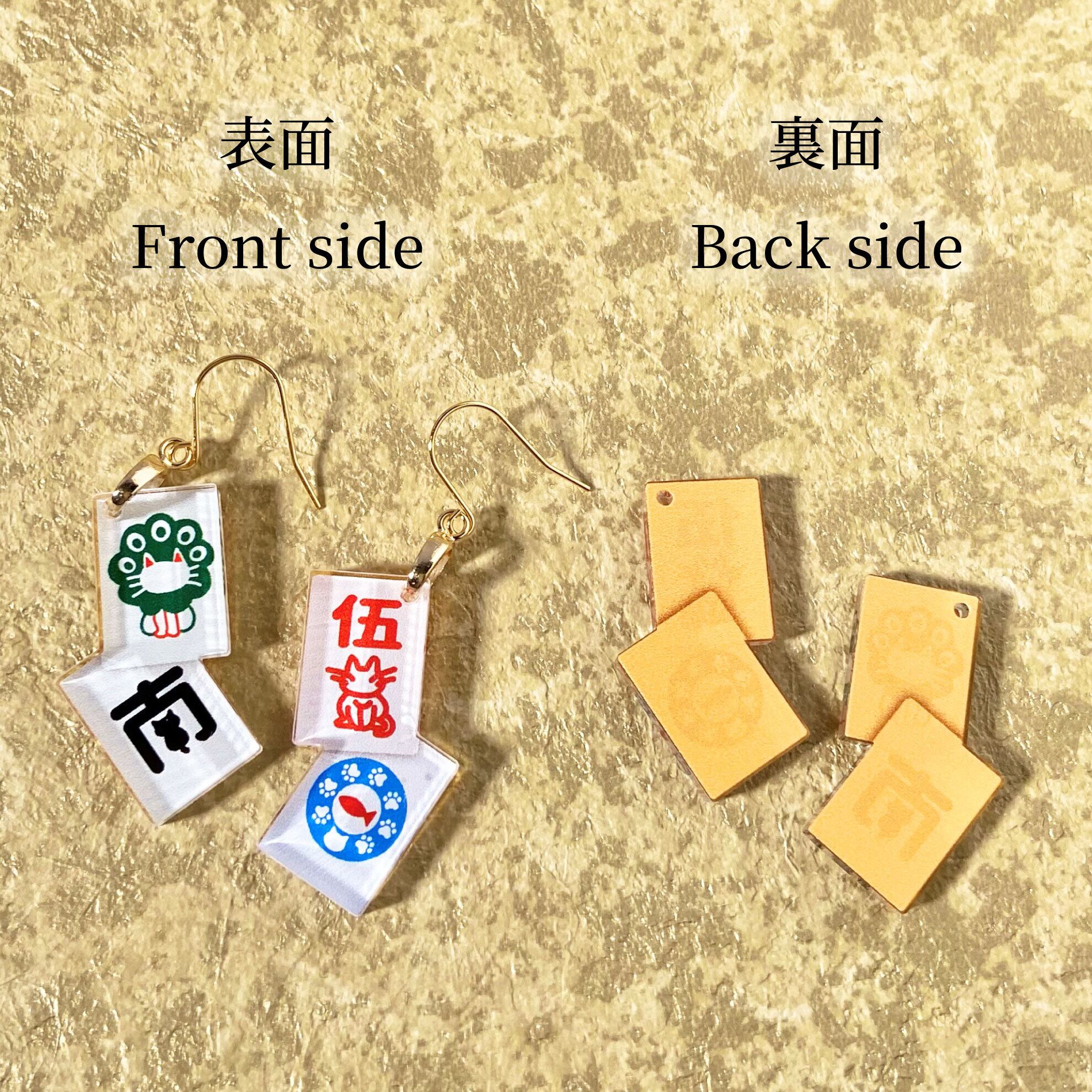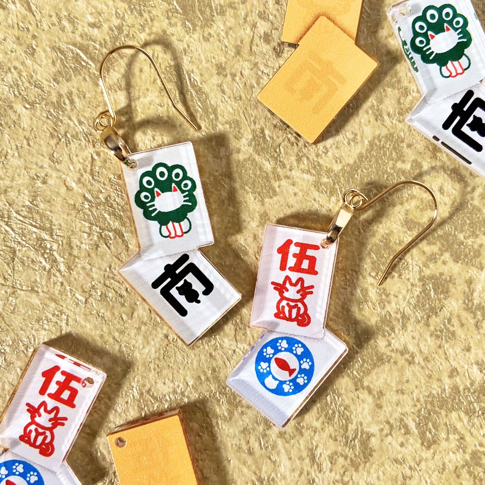 アクリルのころんとした厚みがキュートな、『ねこ × 麻雀』のユニークなピアスです。