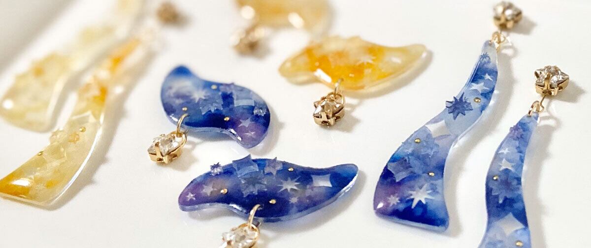 七夕の夜空にかかる天の川がモチーフのピアス。輝く星や、銀河をイメージした水彩グラデーション風カラーが特徴です。星型の切り抜きや、星パーツのトッピングで立体的なデザインとなっています。